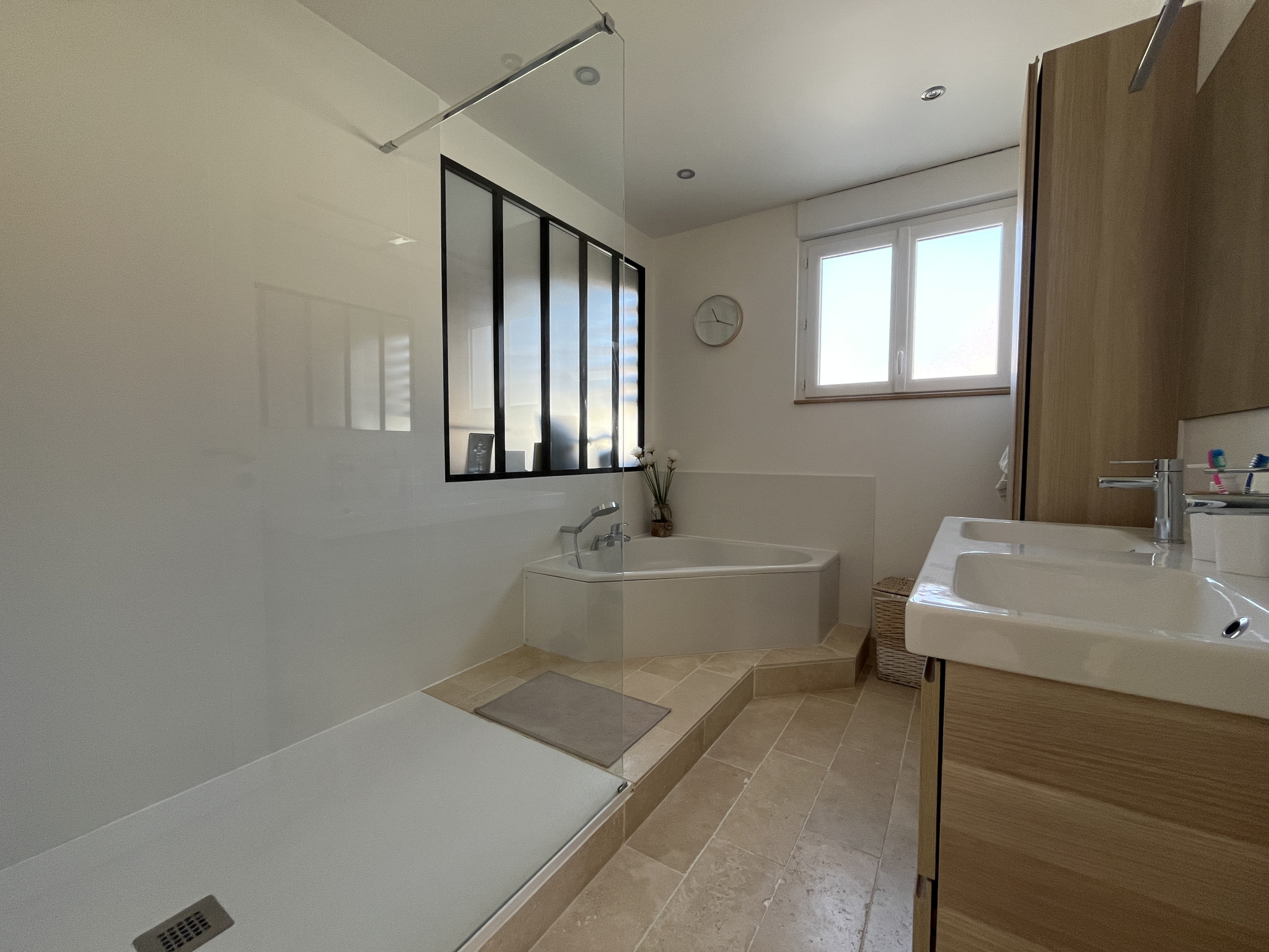 Au rez-de-chaussée, vous trouverez une entrée spacieuse, un WC avec lave-mains, une pièce de vie lumineuse avec cuisine équipée ouverte sur le séjour, une chambre, une salle de douche avec baignoire ainsi qu'un dressing.