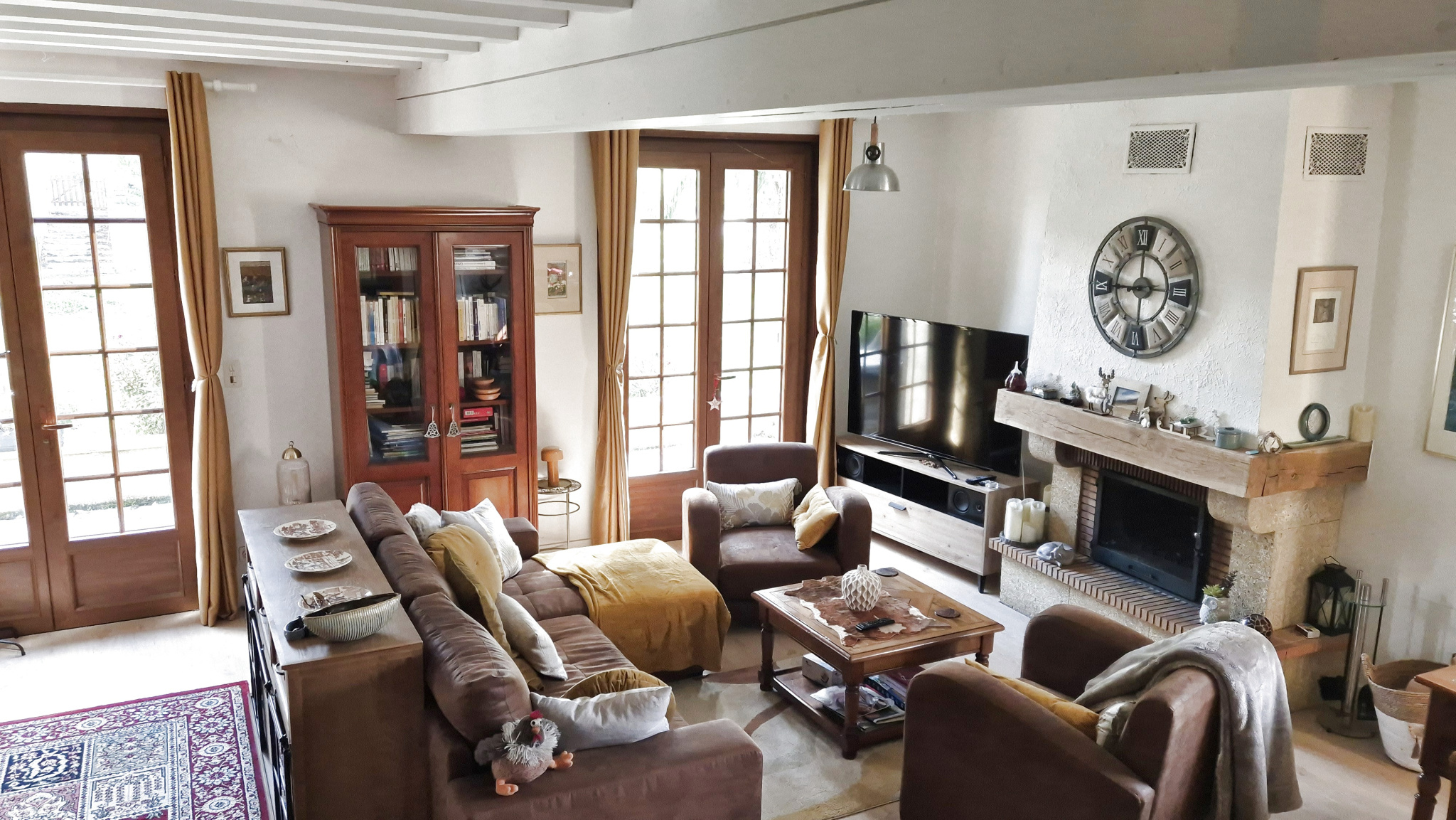 Grande pièce de vie avec cheminée et poutres apparentes