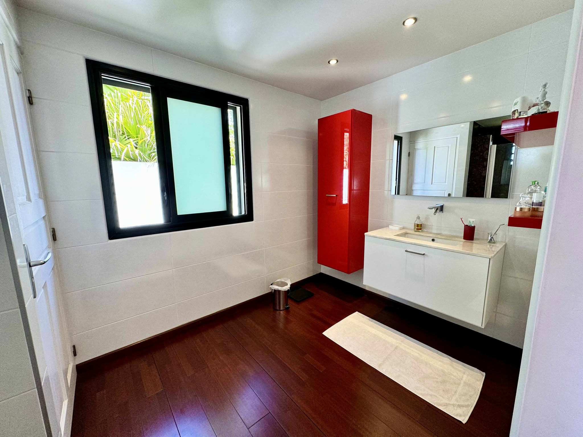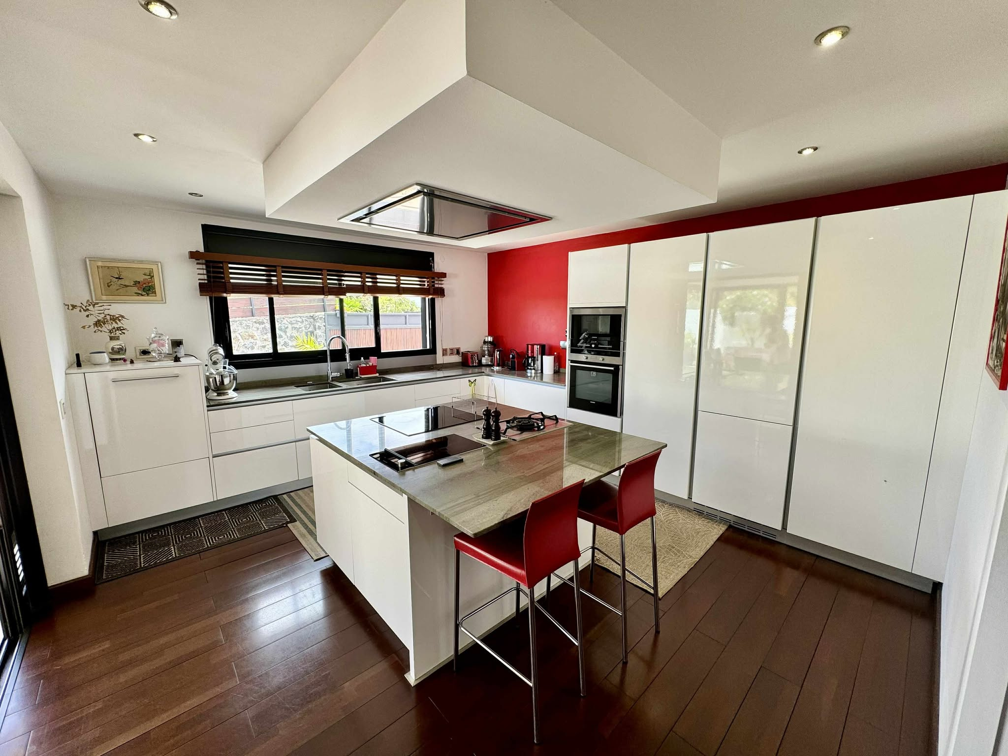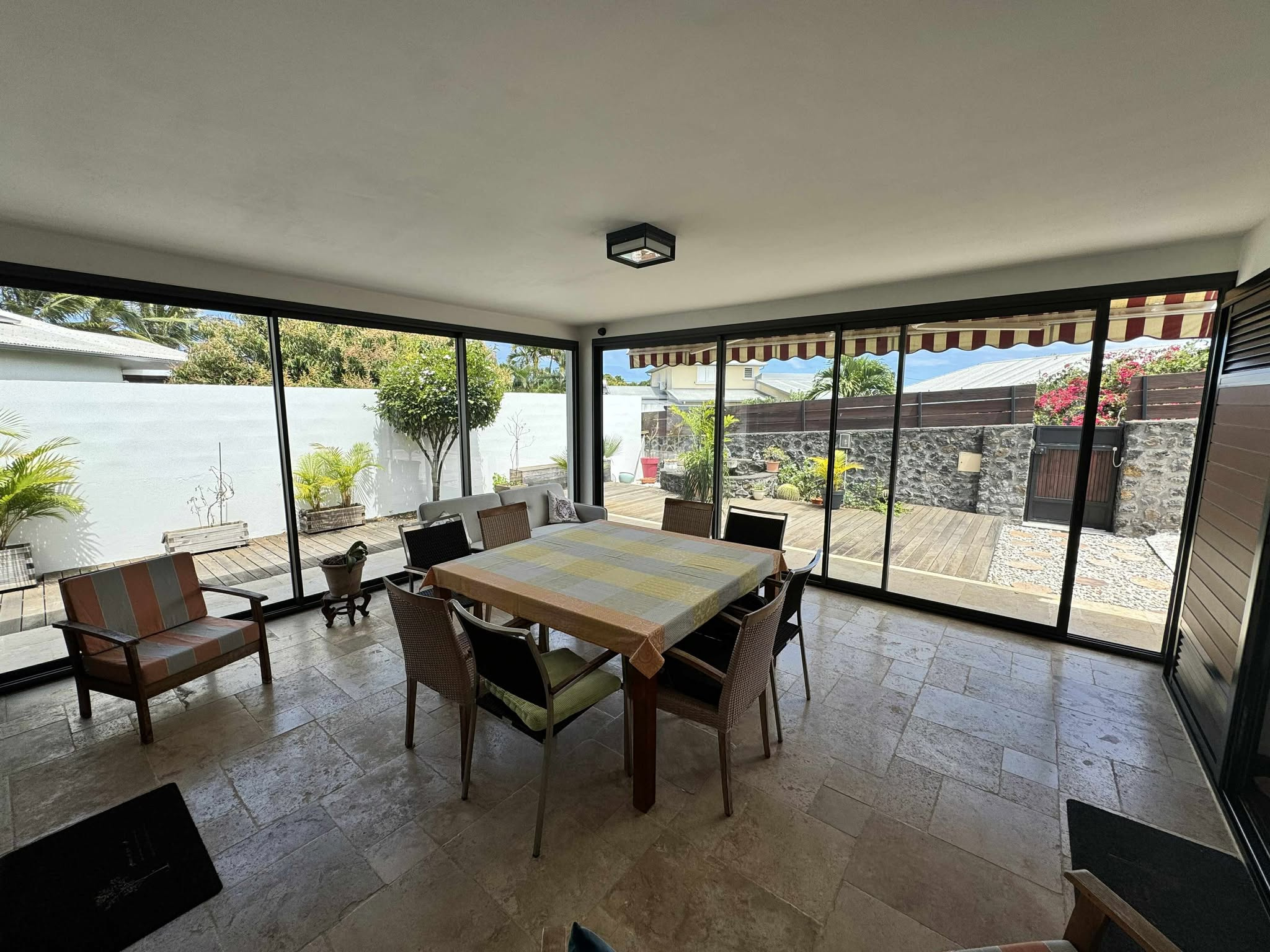 MATERIAUX DE QUALITES : volet roulant électrique noir alu, fenêtre alu, travertin, parquet en bois massif, baie vitré alu noir double vitrage.