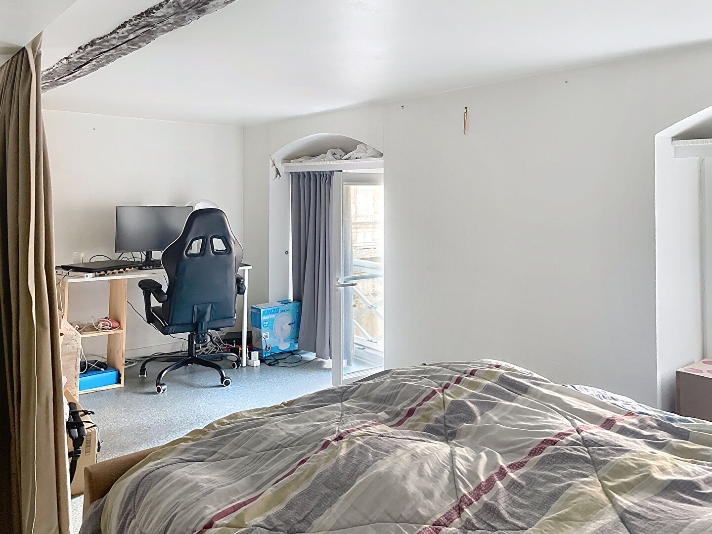 La Rochelle - Centre Ville : dans un magnifique hôtel particulier, appartement T1 Bis avec une pièce à vivre avec une belle hauteur sous plafond et une mezzanine comportant un coin couchage bureau et salle d'eau / WC. Le tout loué en bail meublé, surface plancher non Carrez 23m².