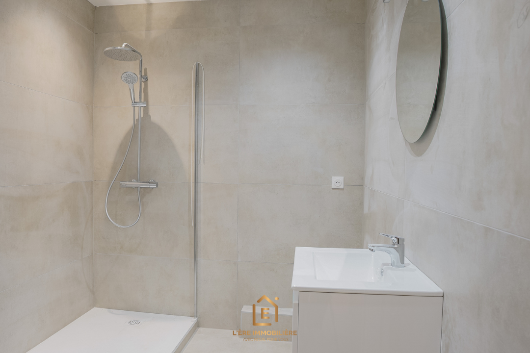 Étage inférieur : deux chambres spacieuses, une salle d'eau avec douche, vasque et WC, ainsi qu'un cellier.