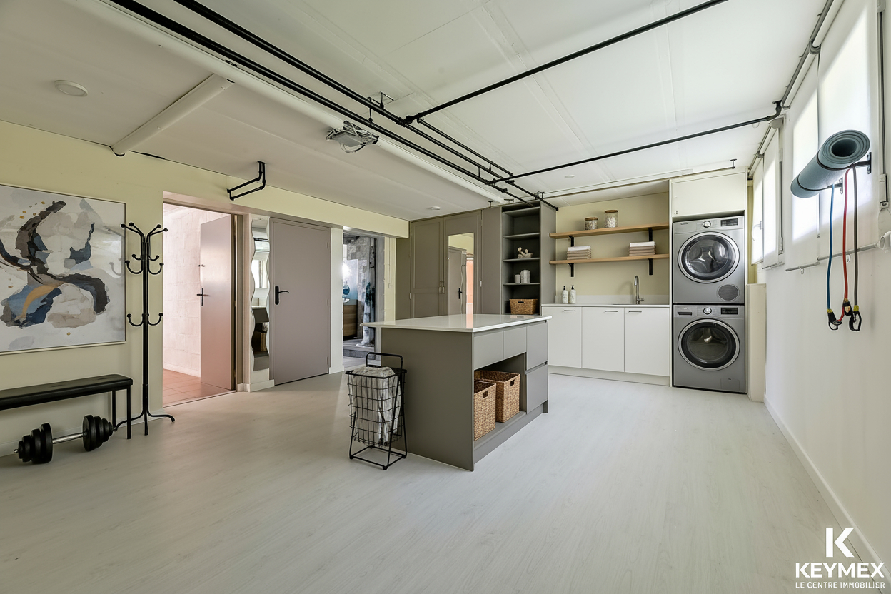 Le sous-sol semi-enterré, entièrement aménagé avec soin, propose une salle d'eau avec WC, un espace buanderie, et une vaste pièce indépendante. Grâce à son accès séparé, cet espace se prête parfaitement à l'exercice d'une profession libérale, à un atelier ou à un espace de réception privé.