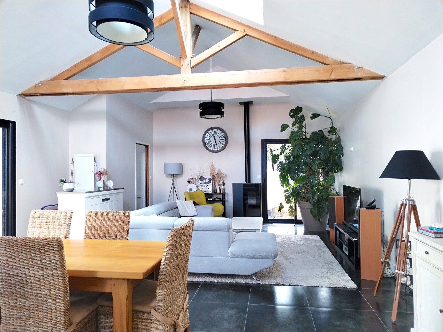 Une pièce de vie de 42 m2 lumineuse, entièrement déplafonnée où il y fait bon vivre avec son poêle à granulés, pour les soirées cocooning.