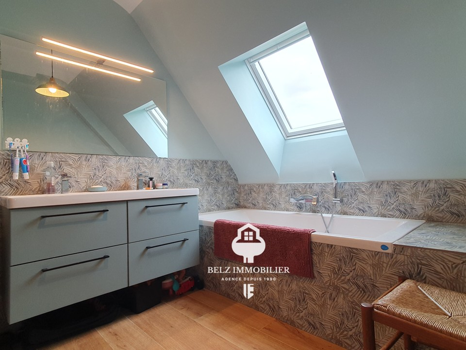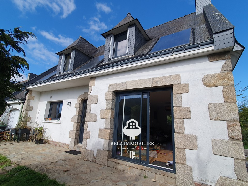 BELZ, A 200m d'une petite plage de la Ria d'Etel, Construction de qualité pour cette néo-bretonne construite en 1972, et rénovée en 2024 à proximité immédiate des sentiers, à seulement 1.8kms des commerces du centre de BELZ, au coeur de ce hameau apprécié. Cette maison dispose d'une entrée, d'une pièce de vie avec cuisine aménagée et équipée ouverte, quatre chambres dont 1 en rdc, un grenier, une salle/d'eau, une salle de bains/2wc. Le tout sur TERRAIN clos et arboré de 936m² en zone constructible.