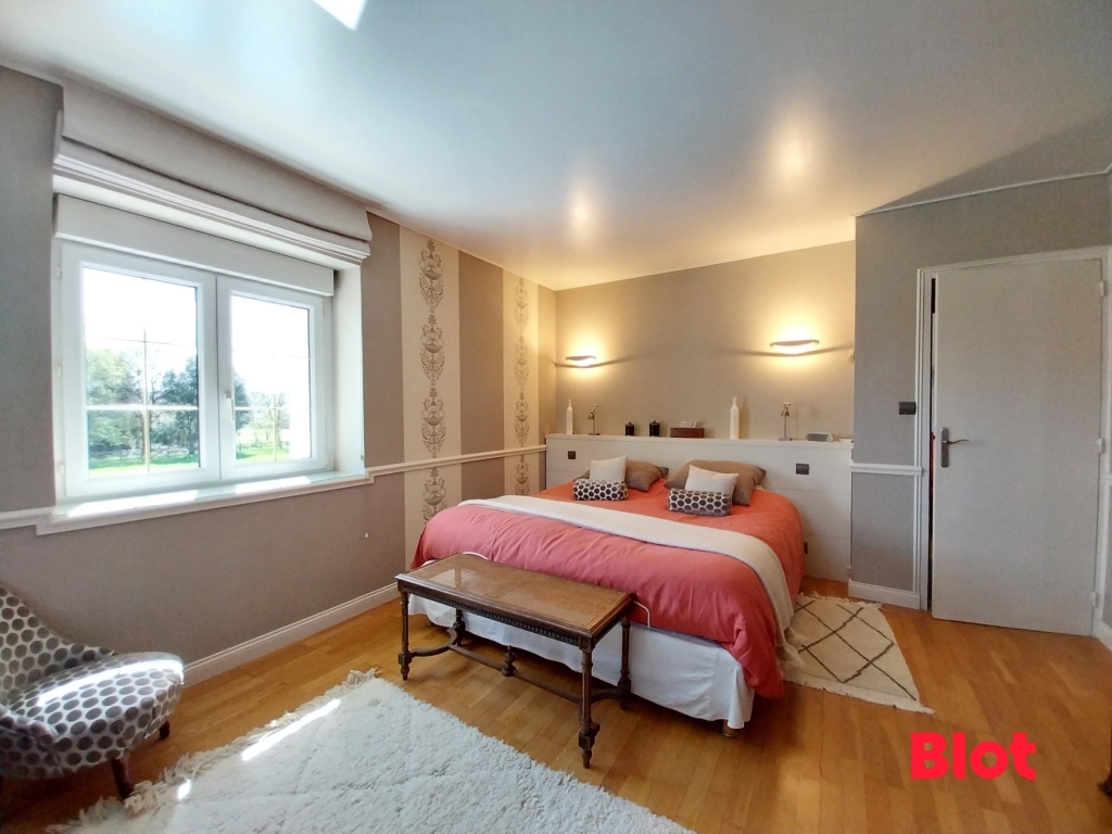 À l'étage, un large palier distribue cinq belles chambres, dont une somptueuse suite parentale avec salle d'eau attenante comprenant douche et baignoire. Une seconde salle d'eau, élégamment aménagée, vient compléter l'espace nuit.