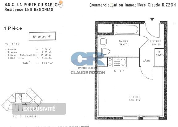 Il se compose d'une entrée avec placard, d'une pièce à vivre lumineuse ouverte sur une kitchenette fonctionnelle, ainsi que d'une salle de bains avec WC.