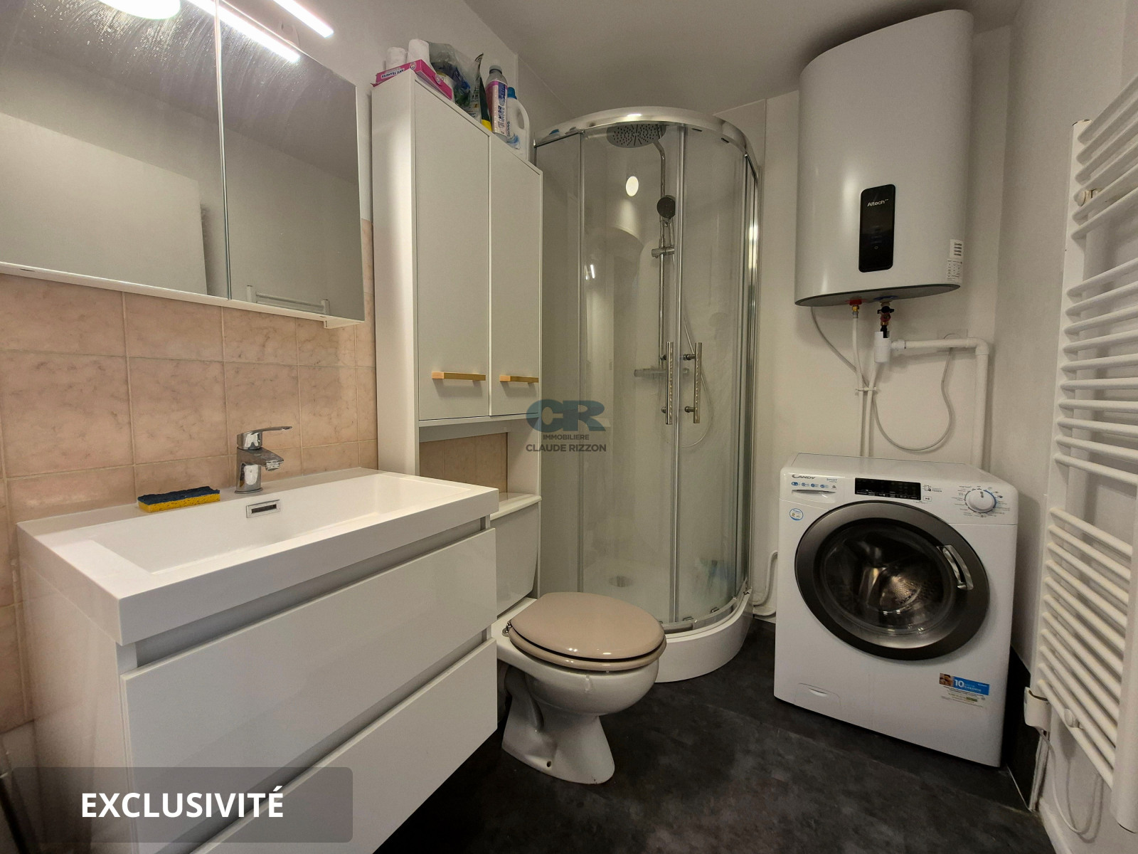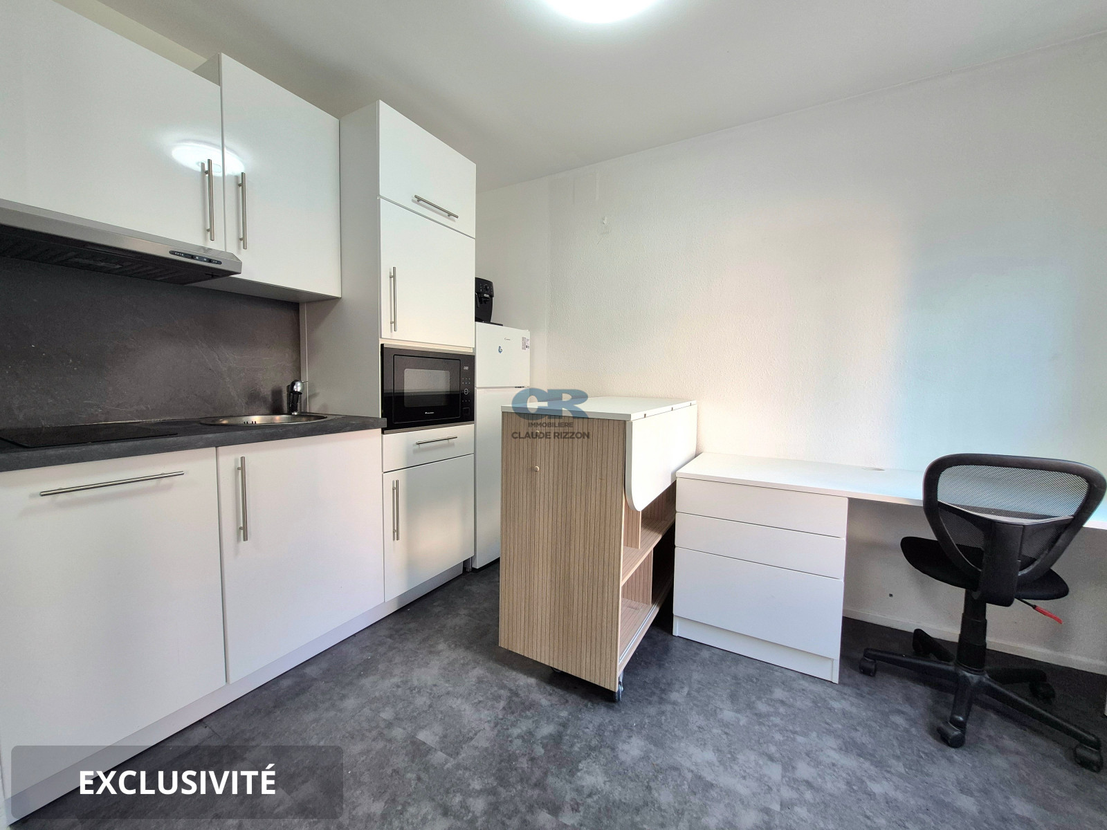 Ce studio offre une entrée avec un placard, une charmante pièce de vie, un espace kitchenette équipé d'électroménagers neufs et une salle de bains avec une douche et un WC.