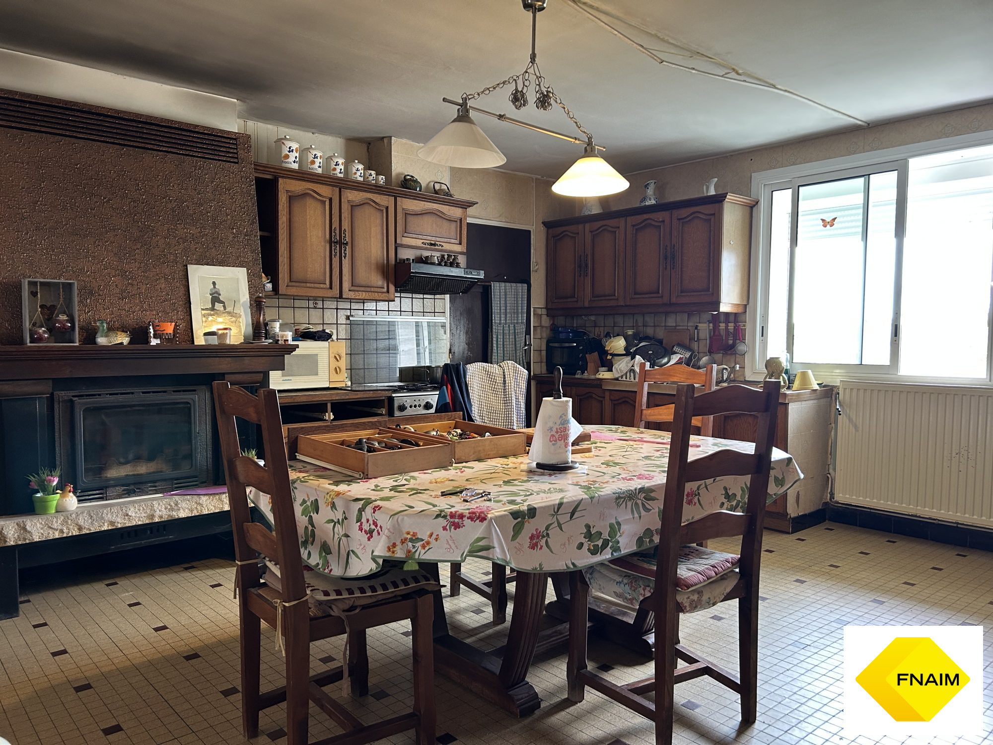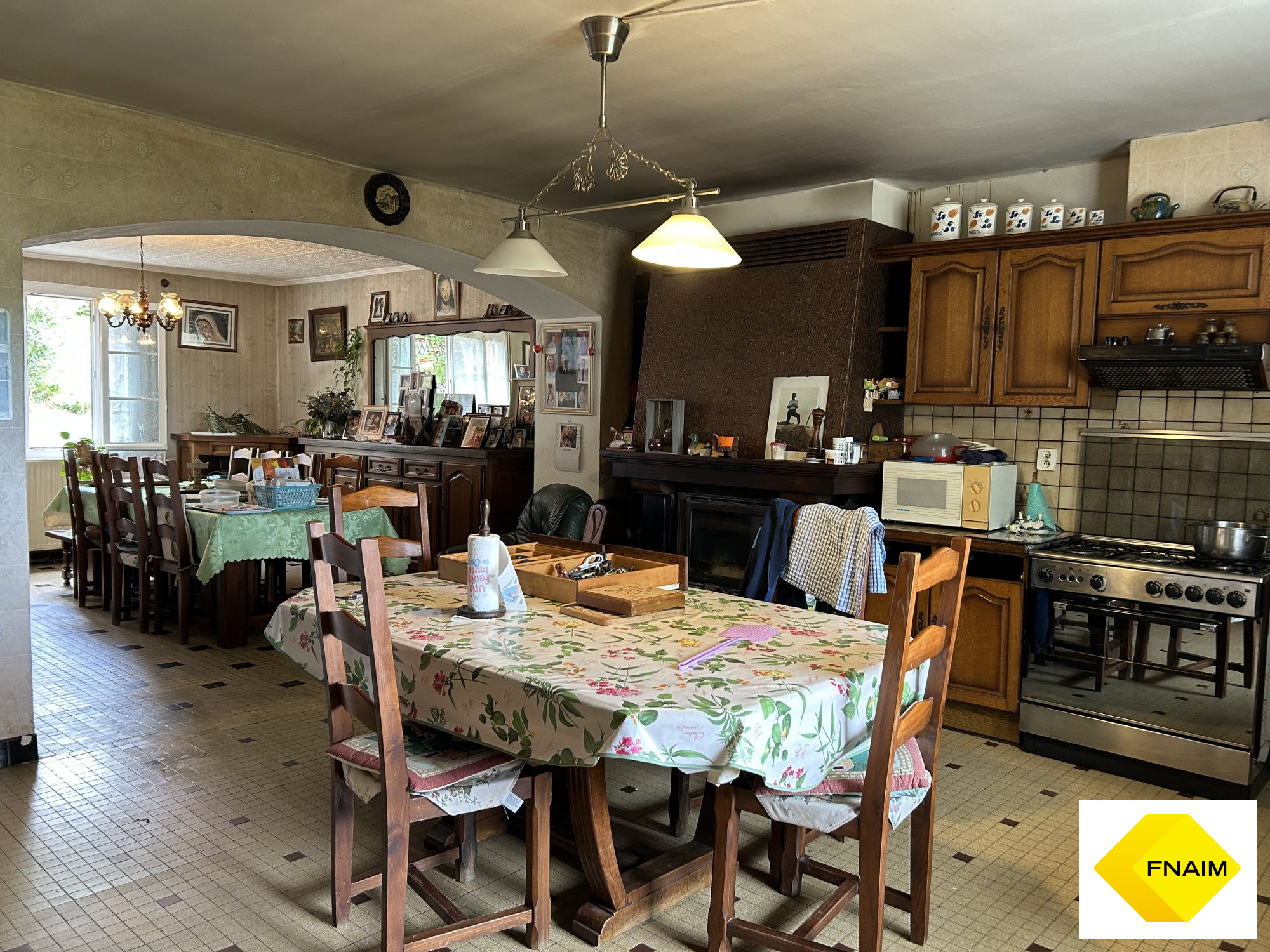 La maison, à rénover, de 186 m² habitables, se compose d'une pièce de vie lumineuse de 46 m² avec cuisine, de 6 chambres, d'une salle de bains, d'une salle d'eau, d'un WC indépendant, d'une seconde cuisine, d'une chaufferie et de divers espaces de rangement.