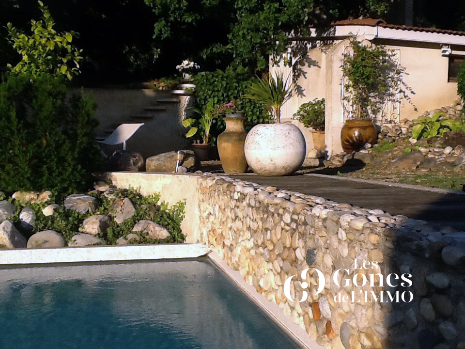 Extérieur : un terrain arboré de plus de 1.300 m2, un pool-house avec douche et sanitaires, et surtout une piscine à débordement chauffée avec vue magique sur la vallée