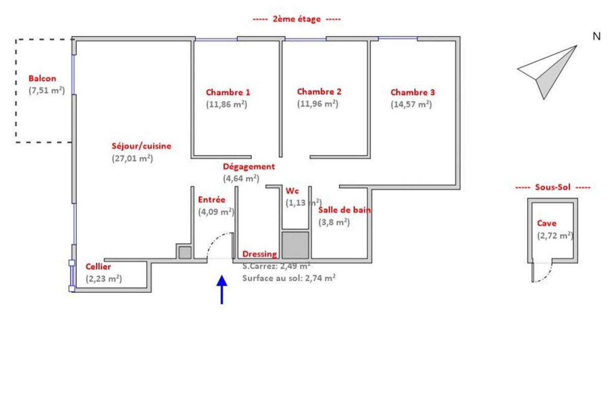 3 chambres spacieuses (12 m², 12 m² et 14,5 m²)