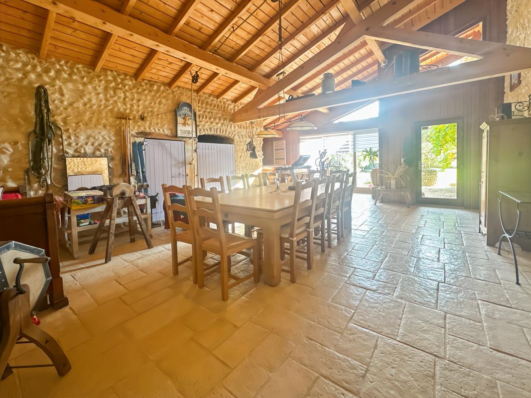 Intérieur : cuisine aménagée et équipée (2020) avec ilot central, ouverte sur un agréable espace repas, salon cosy avec poêle à bois, ambiance chaleureuse, grande pièce de réception de 58 m² : espaces détente, jacuzzi, murs en pierre apparente, belle hauteur sous plafond, grande baie vitrée donnant sur le jardin, à l'étage, 4 chambres , deux espaces dressing, et une mezzanine spacieuse, 1 salle d'eau (deuxième salle d'eau en en rez-de-chaussée).
