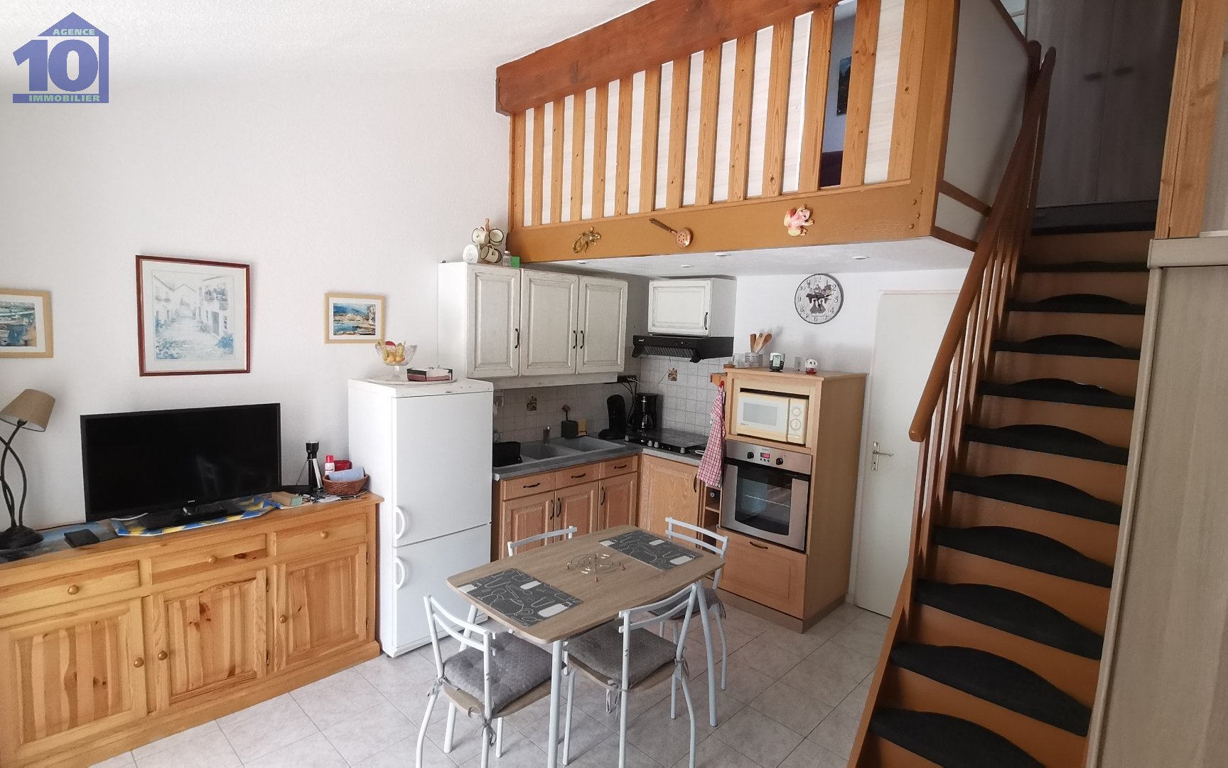 L'étage accueille une seconde chambre en mezzanine avec vélux et rangements, idéale pour accueillir famille ou amis. Le pavillon est vendu meublé, prêt à être utilisé immédiatement, et dispose d'une place de stationnement privative au sein de la résidence.