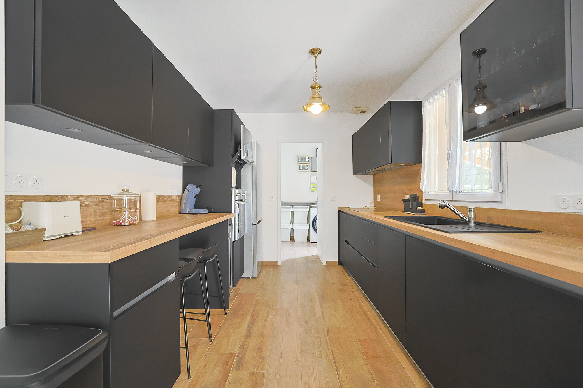 Séjour avec baies à galandage avec cuisine ouverte de 43m2 : avec grand cellier/ buanderie