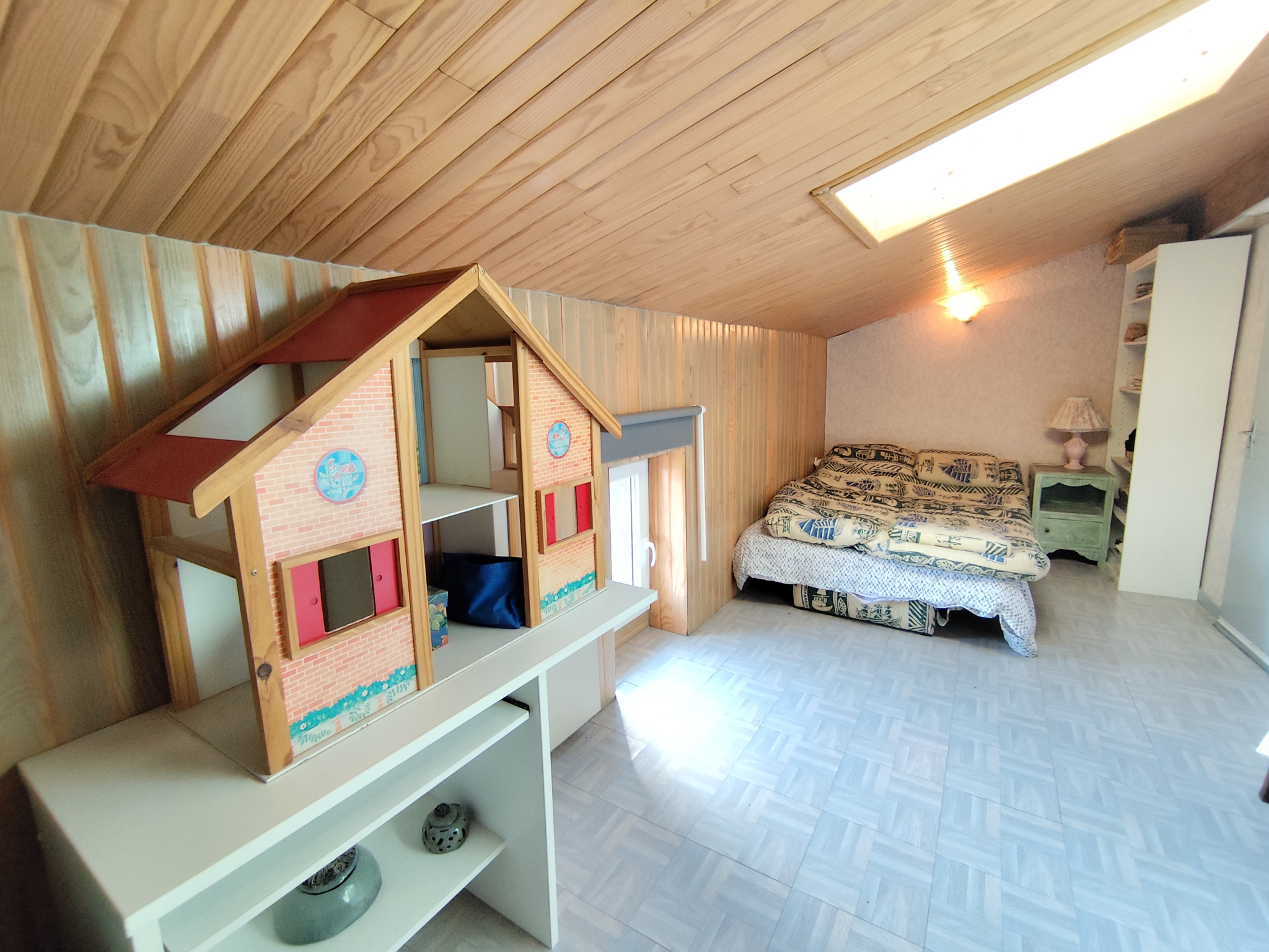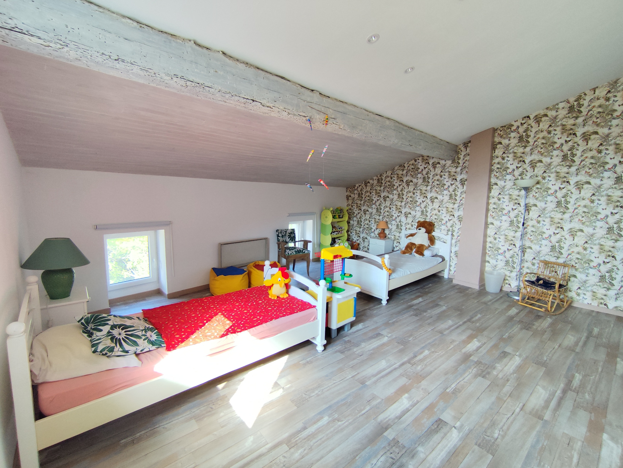 À l'étage, un palier pouvant faire office de salon dessert une première chambre. Au deuxième étage, vous trouverez deux chambres supplémentaires ainsi qu'un WC communiquant.