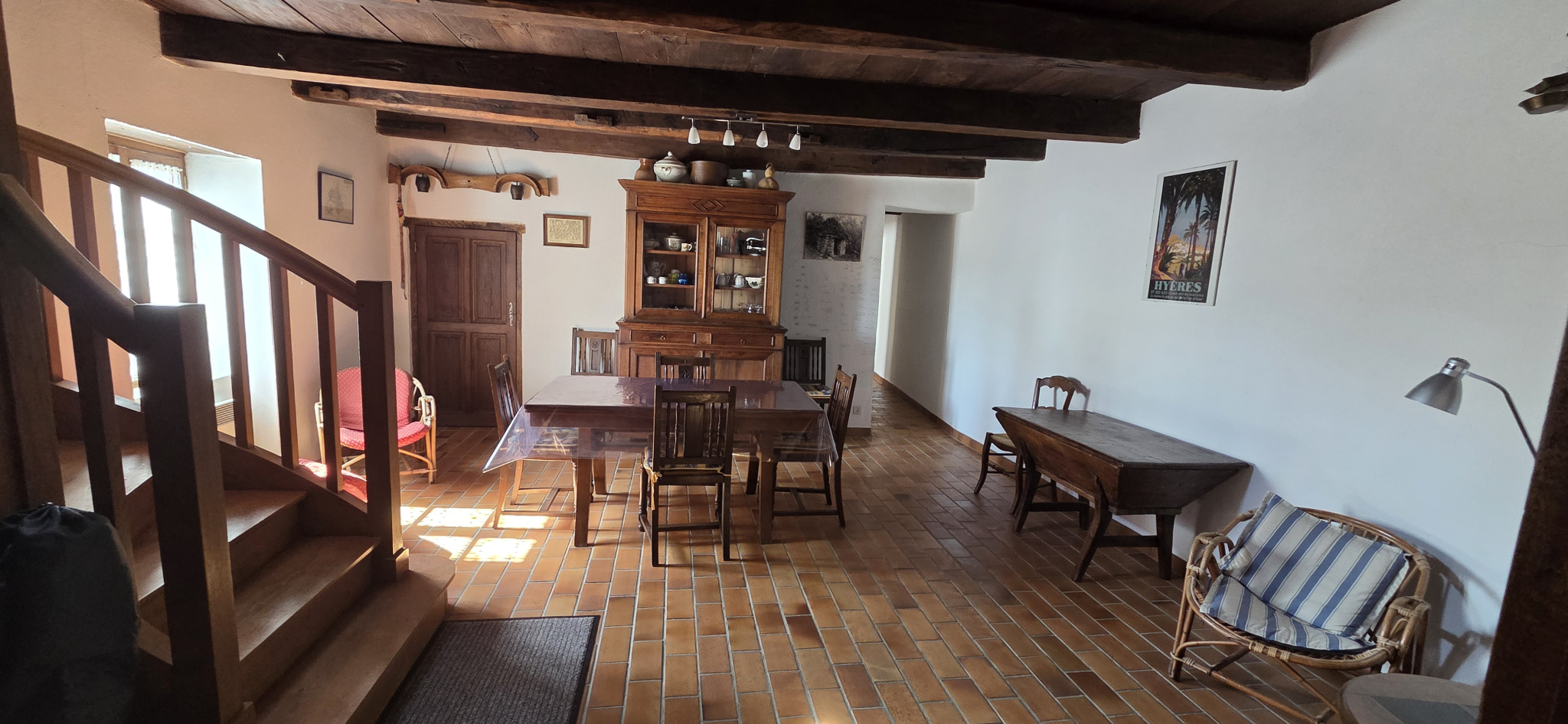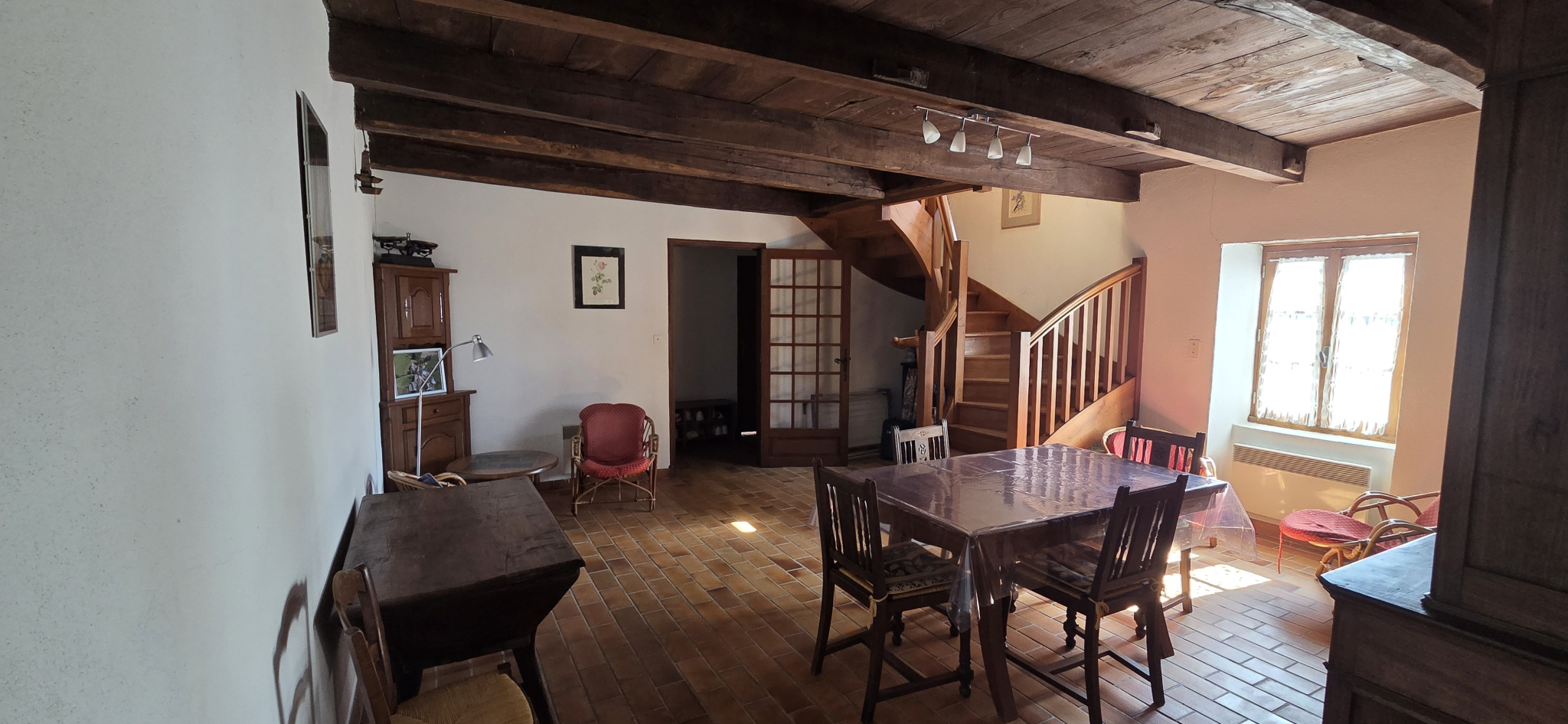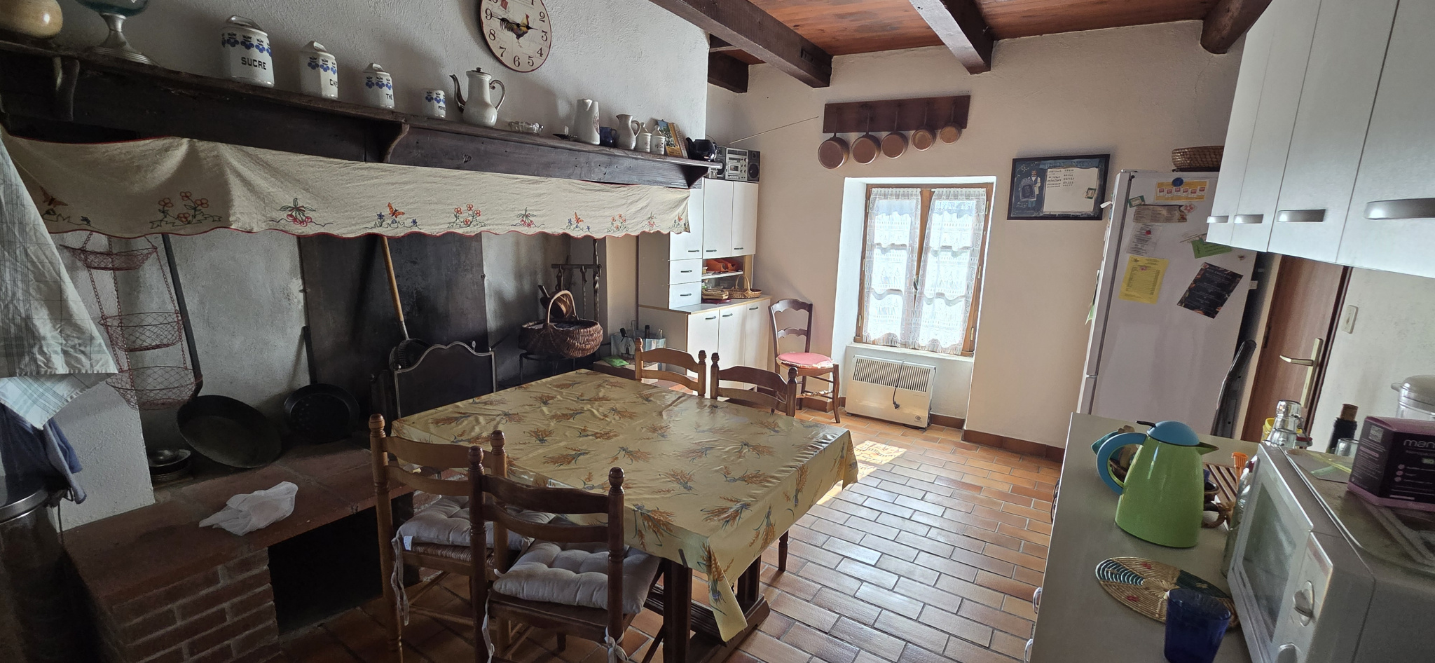 Le rez-de-chaussée se compose d'une entrée desservant une cuisine indépendante, un salon et une salle à manger. Vous y trouverez également deux chambres spacieuses, une salle d'eau en bon état et un WC séparé. Une grande terrasse accessible depuis ce niveau permet de profiter pleinement de l'extérieur. À l'étage, deux espaces distincts, séparés par une porte, offrent la possibilité d'aménager une chambre supplémentaire et une salle d'eau selon vos besoins. La maison dispose d'une cheminée existante (remise en service possible) et de radiateurs électriques.