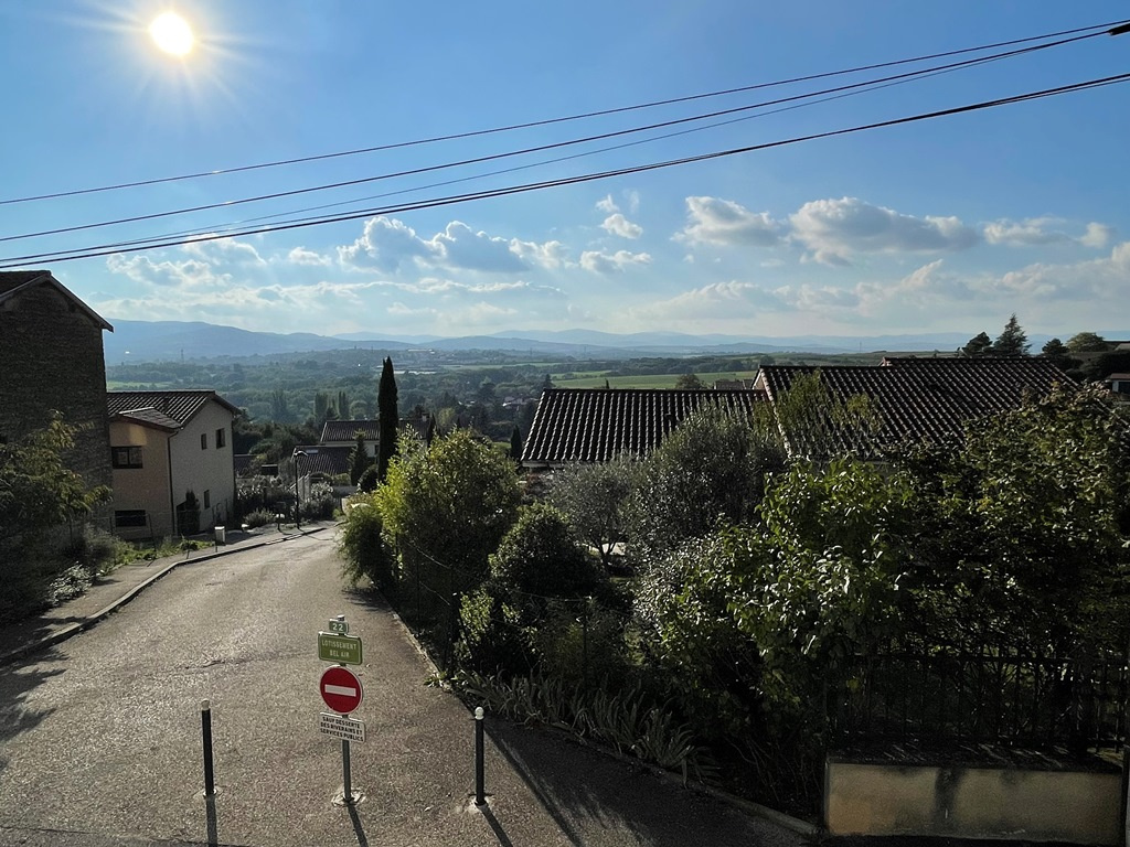 La pièce de vie spacieuse et baignée de lumière naturelle accueille un grand séjour double avec une cuisine aménagée et équipée ouverte, ouvrant directement sur une agréable terrasse couverte. Le tout offre une vue dégagée à l'ouest sur les monts du Lyonnais.