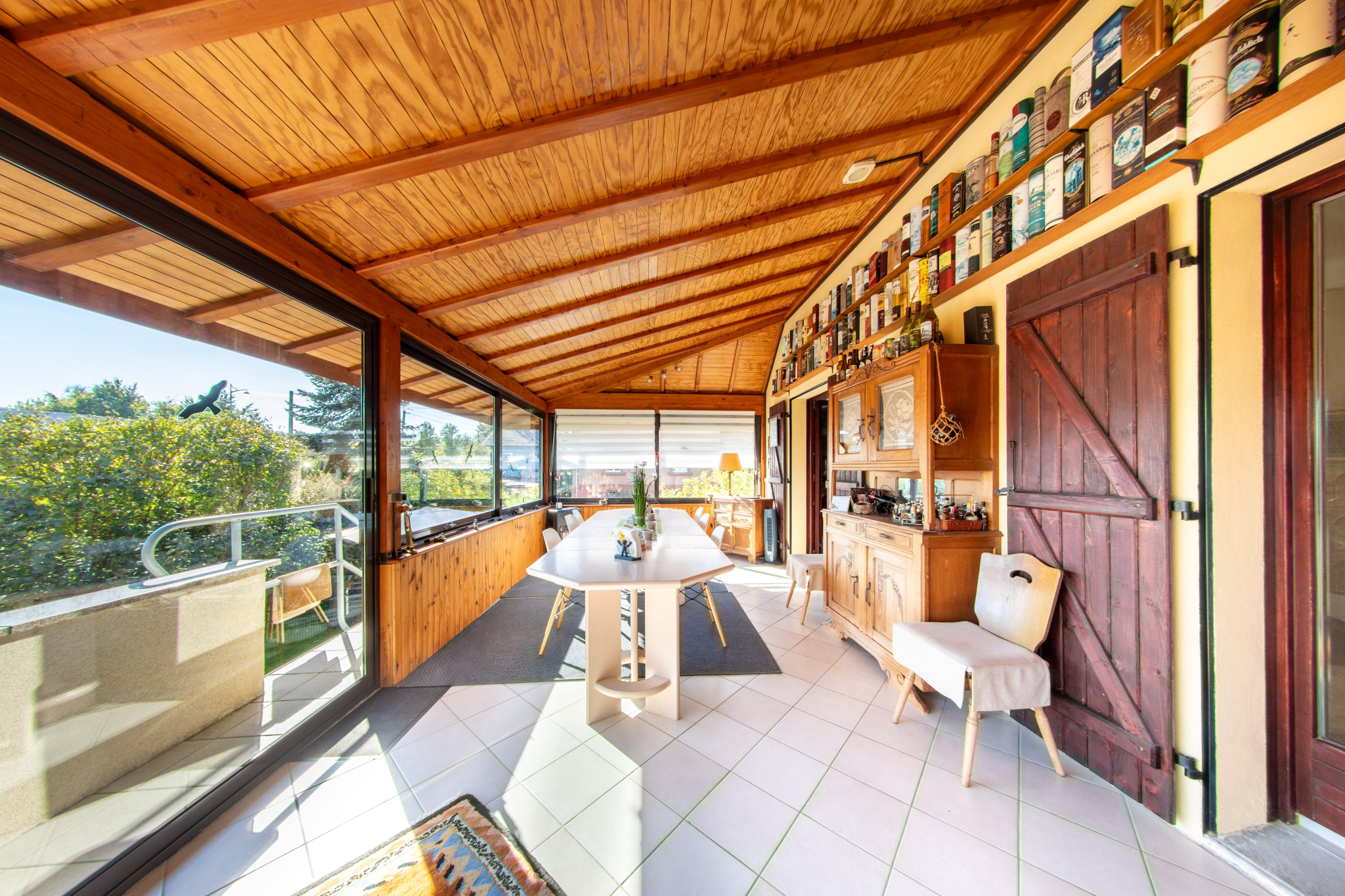 La maison se compose au rdc d'une entrée, d'une cuisine équipée ouverte sur un salon salle à manger, donnant accès à une belle véranda baignée de lumière, idéale pour profiter pleinement de chaque saison, d'un bureau et d'un wc.