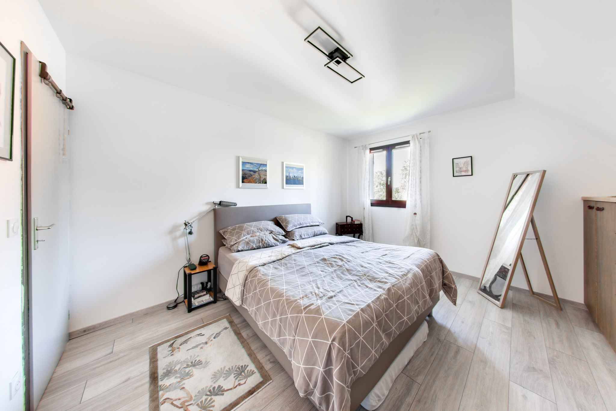A l'étage, on trouve deux chambres, ainsi que d'une salle de bains.