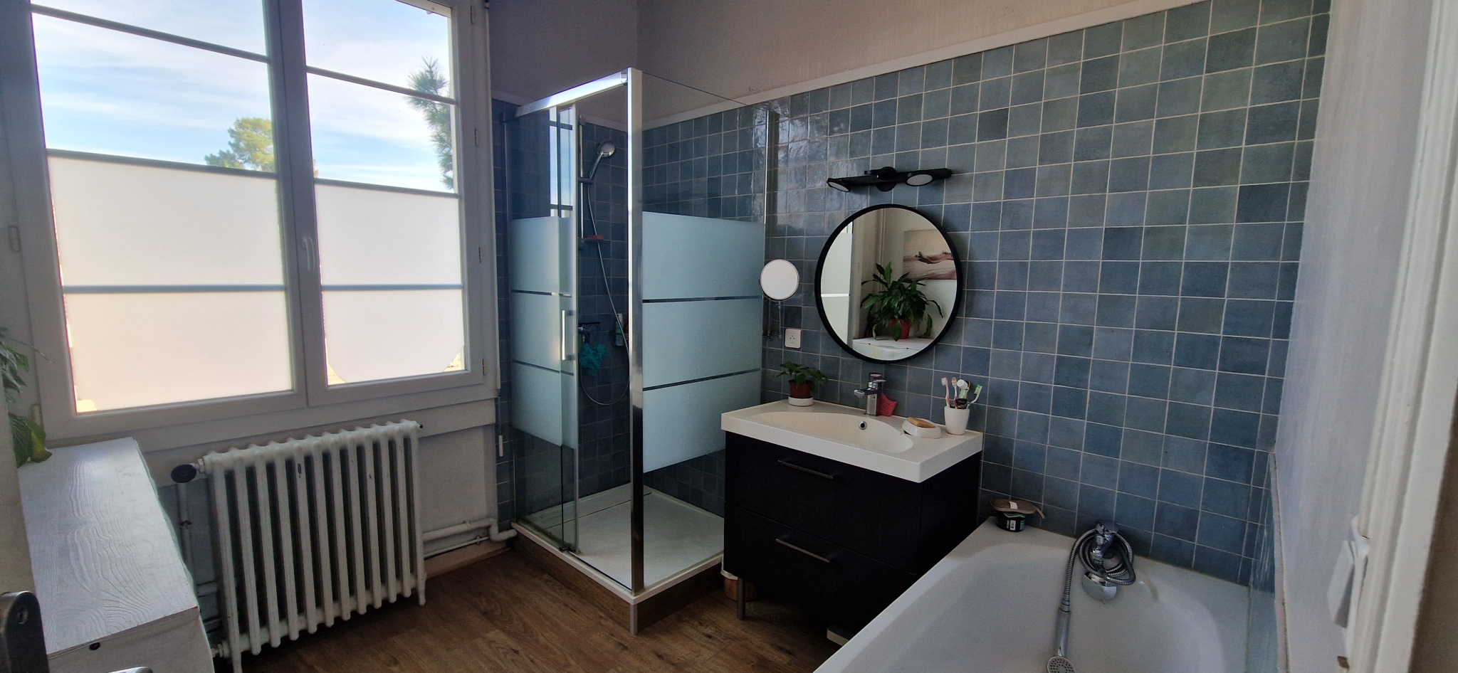 À l'étage : 3 grandes chambres, salle de bain avec baignoire et douche, WC indépendant.
