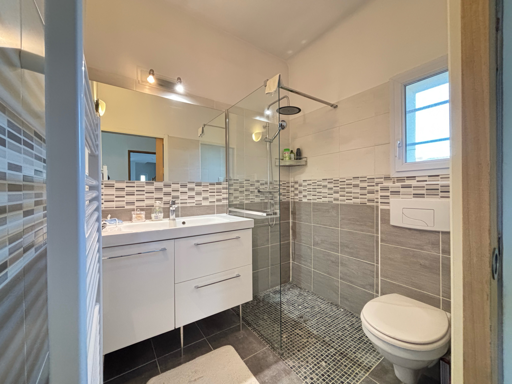 Le jardin, sans vis-à-vis, offre un cadre agréable. La maison bénéficie de prestations de qualité avec un parquet en chêne, des volets roulants électriques, un double vitrage PVC, une isolation par l'extérieur et des panneaux photovoltaïques.