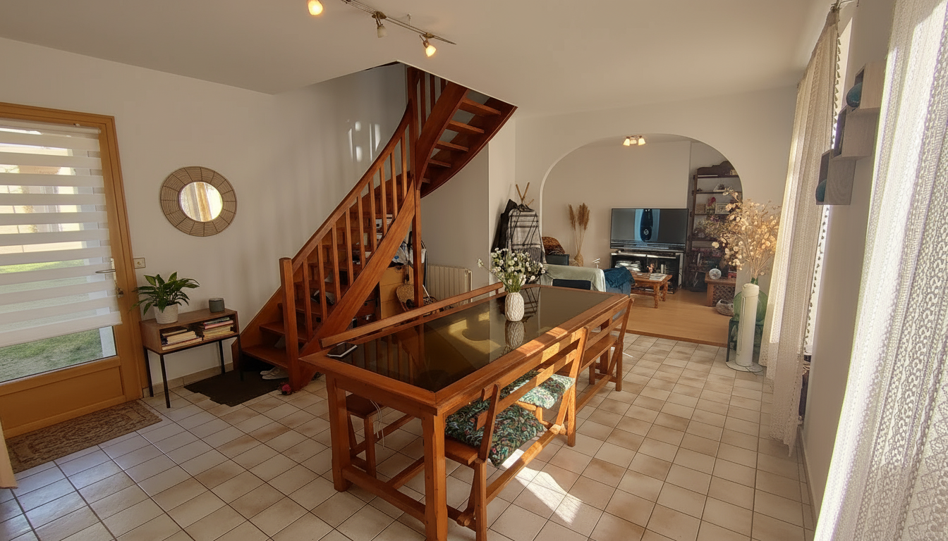 Dès l'entrée, vous découvrez une belle pièce de vie lumineuse avec un salon ouvert et chaleureux. Quelques marches mènent à la cuisine fonctionnelle et aux toilettes indépendantes.