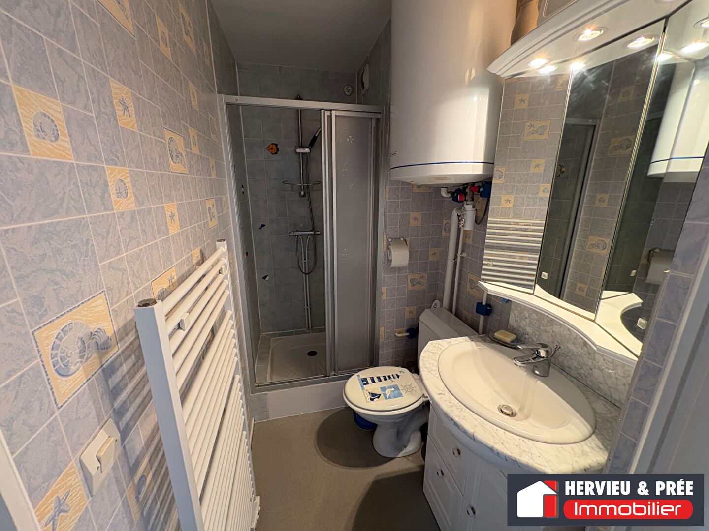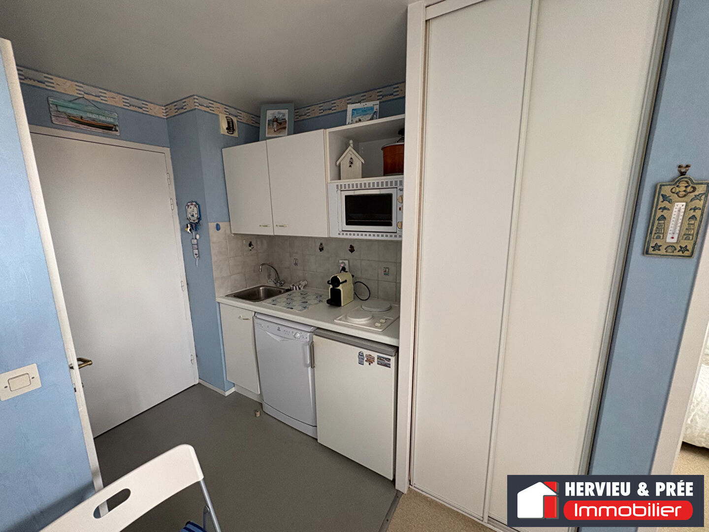 A proximité immédiate de la plage de Riva-Bella, studio cabine en parfait état comprenant : entrée, kitchenette équipée, séjour accès balcon ensoleillé, salle de douche avec wc, cabine. Local vélo commun.