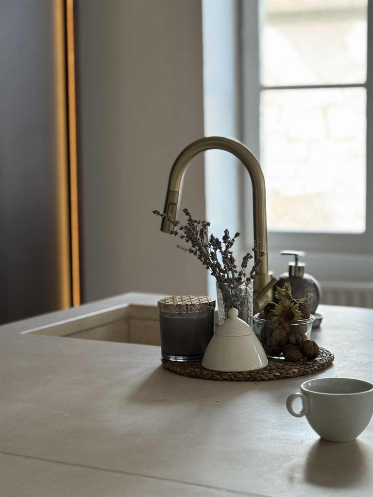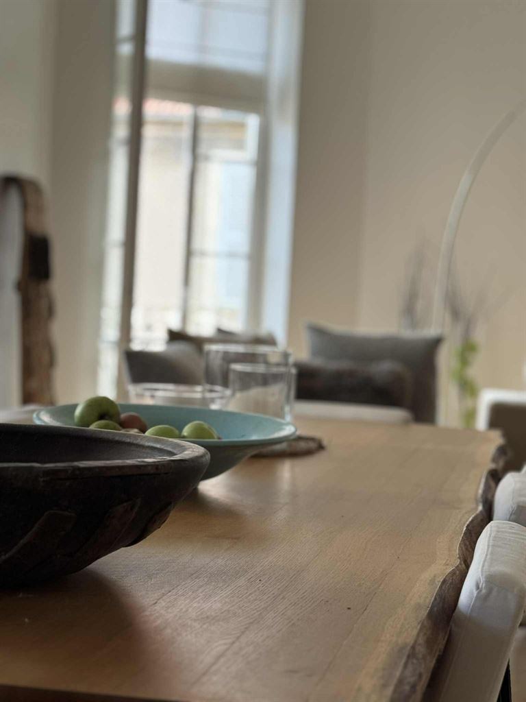 Derrière son ancienne porte cochère, une vaste pièce de 65 m² ouvre le bal. Un escalier en pierre, conduit ensuite vers un niveau de vie principal d’environ 120 m² : salon-séjour traversant, cuisine équipée sublimée par un plan de travail en pierre naturelle, salle d’eau et toilettes. Le parquet en chêne massif, posé en bâton rompu, souligne le caractère raffiné de l’ensemble.