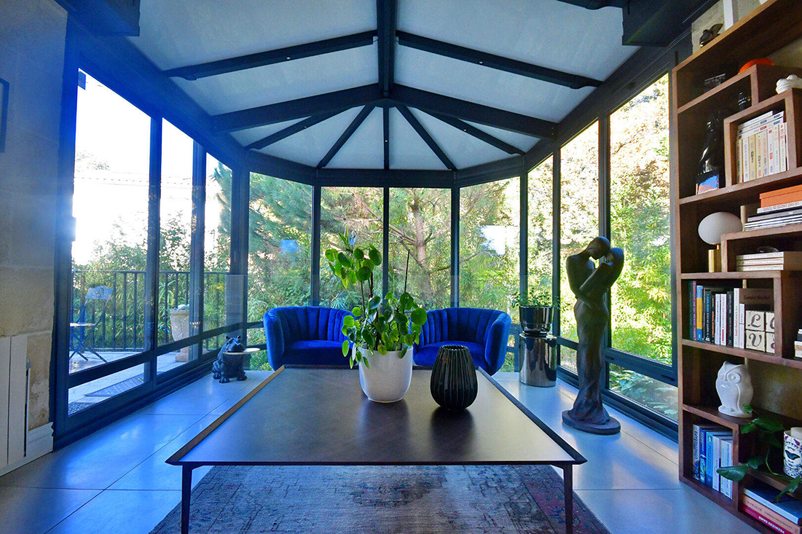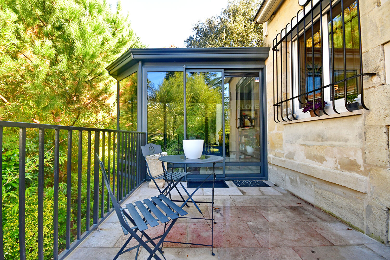 Une véranda baignée de lumière, idéal pour un espace de détente, lecture qui s'ouvre sur une jolie terrasse à l'abri des regards.