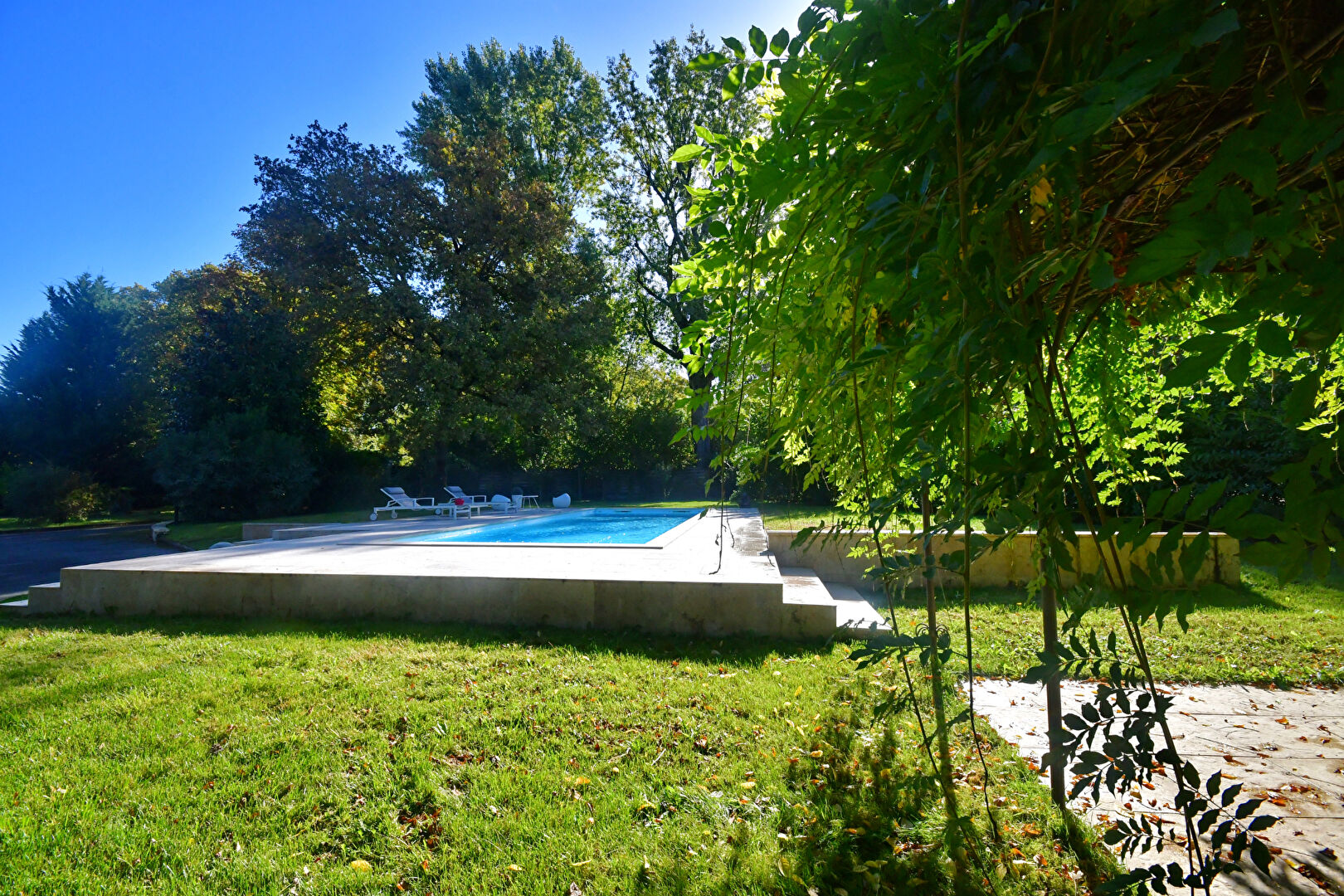 Une piscine au sel 11x3.5 pour profiter du grand jardin paysager et sa terrasse ensoleillée.