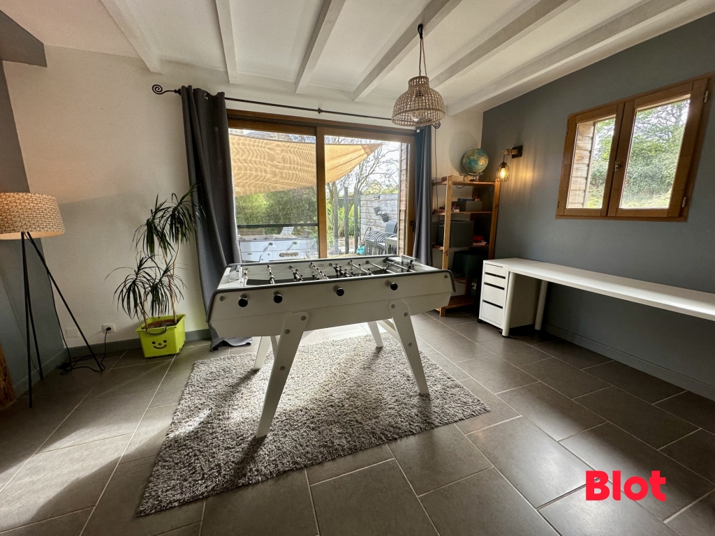 Au rez-de-chaussée, vous trouverez une cuisine aménagée avec coin repas et poêle à granulés, un salon séjour chaleureux avec pierres apparentes et cheminée, un hall d'entrée, une buanderie, un espace bureau et un WC. À l'étage, une mezzanine dessert quatre chambres, une salle de bains avec douche, baignoire et WC, une salle d'eau avec WC, ainsi qu'un espace salle de jeu idéal pour les enfants.