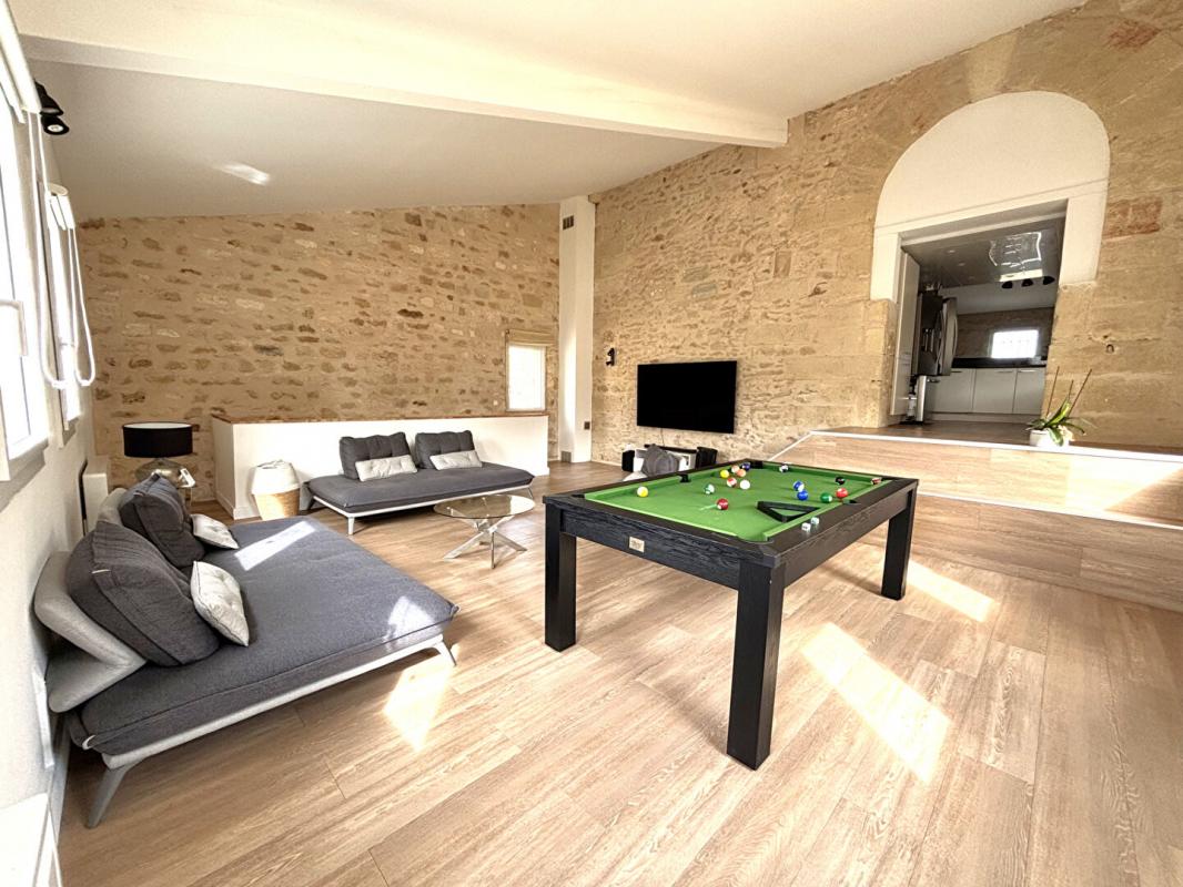 La première partie de la demeure est composée d'une cuisine aménagée ouverte sur un salon séjour baigné de lumière avec vue sur la piscine, 4 chambres très spacieuses, une salle de bain, une salle d'eau, deux toilettes et une buanderie. La visite se poursuit à l'étage par une superbe pièce détente impressionnante par ses volumes et sa hauteur sous plafond idéale pour créer une salle TV, coin jeux, espace de réception. De cette pièce vous avez accès à la deuxième partie du mas entièrement pensée pour accueillir famille, amis ou pour développer une activité locative.