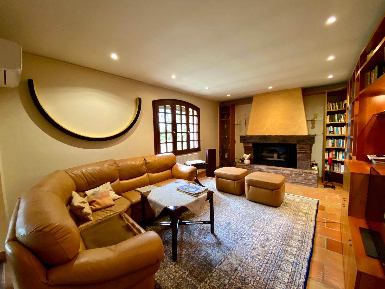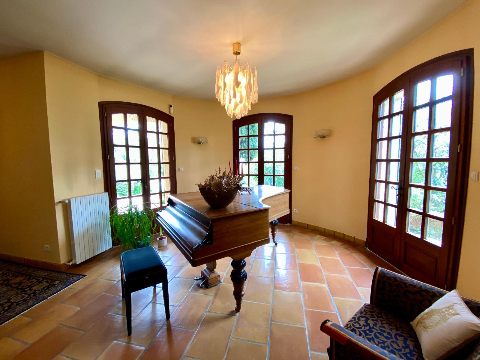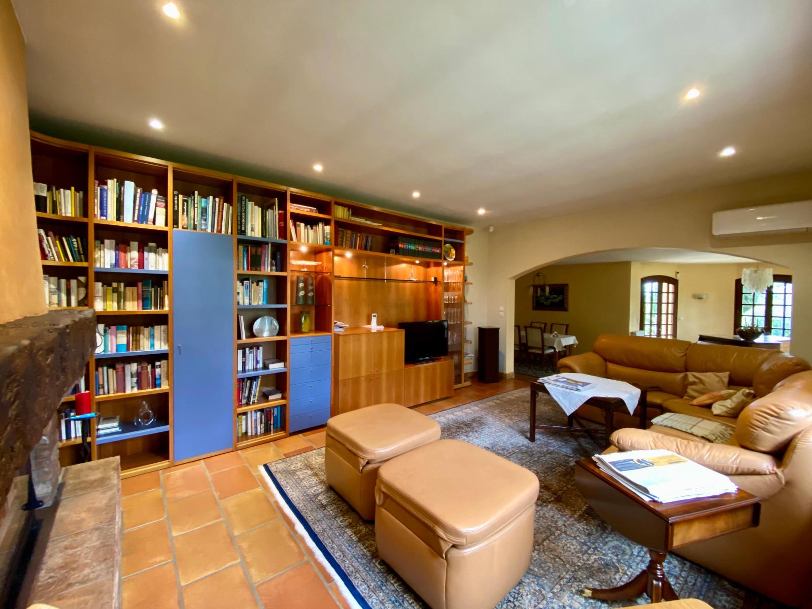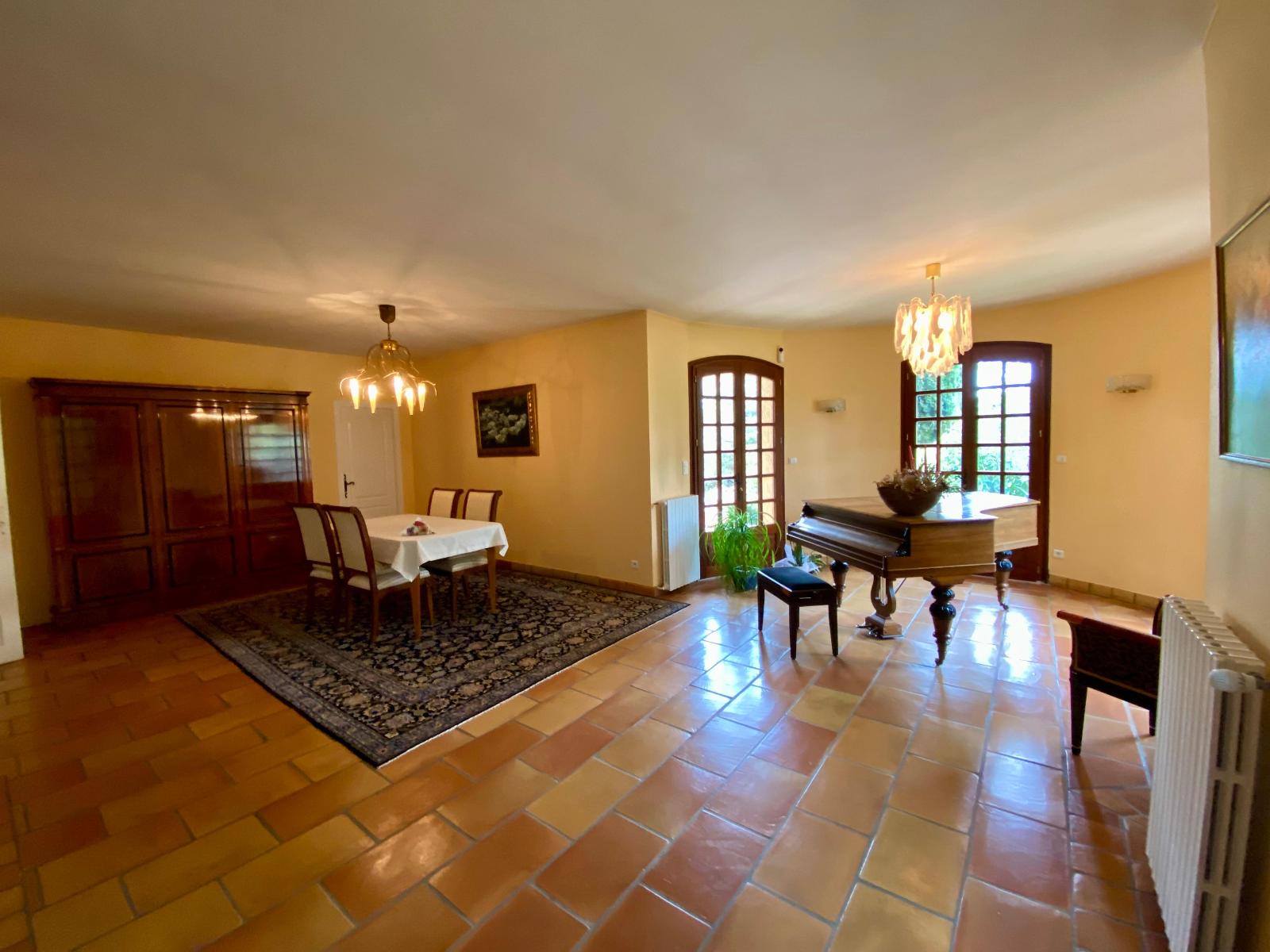 La pièce de vie principale regroupe un salon avec cheminée à insert, une bibliothèque, un espace musique, et une salle à manger conviviale. La cuisine séparée et équipée s'ouvre également sur la terrasse.