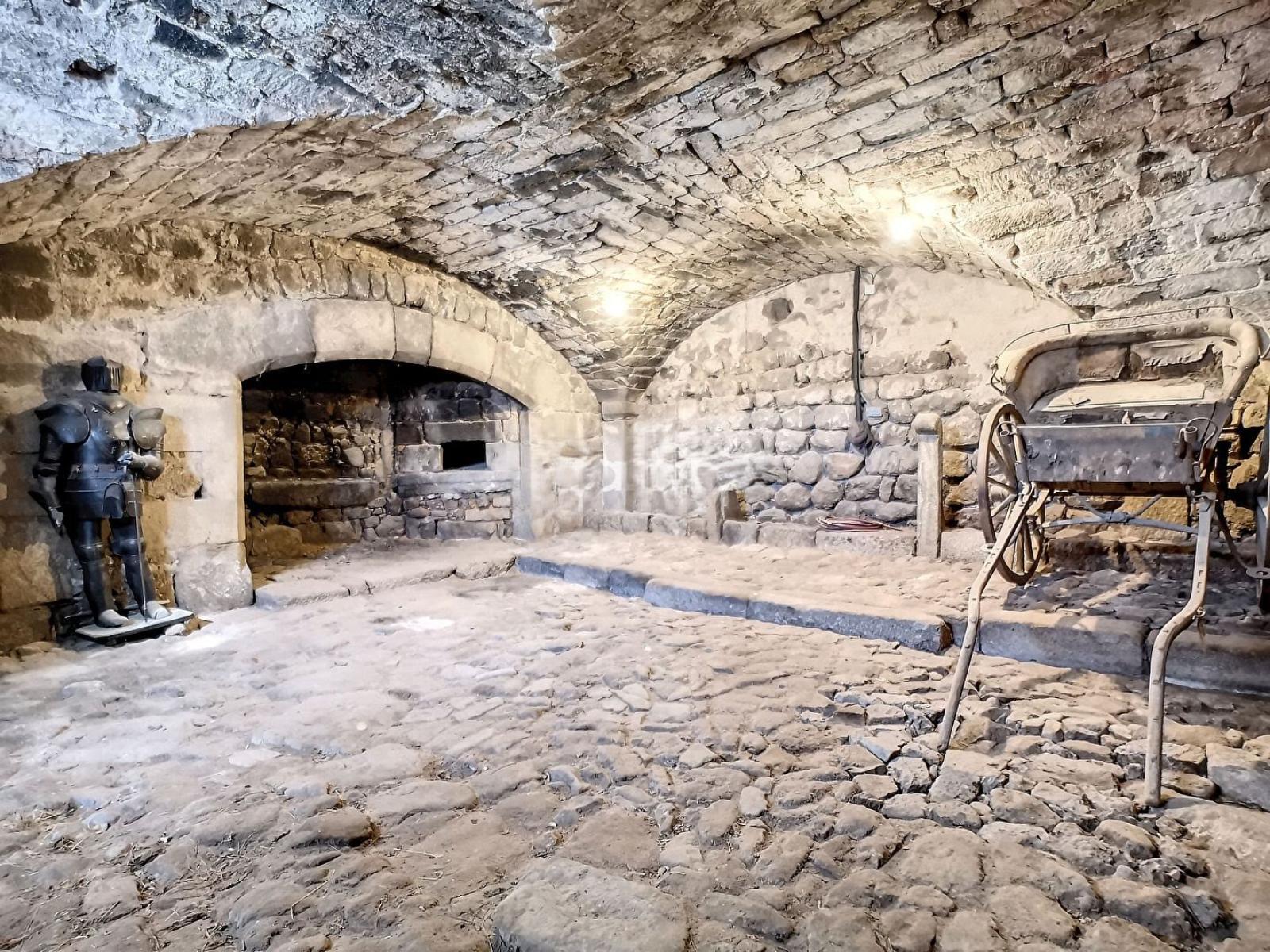 - Au rez de chaussée, une grande écurie avec un superbe plafond voûté en pierres de taille, 3 caves en voûte tout aussi splendides, une immense cheminée d'époque, une entrée avec la porte d'accès du seigneur en bas des escaliers en vis, ainsi que le cachot et les oubliettes. Le tout pour une superficie de 200 M².