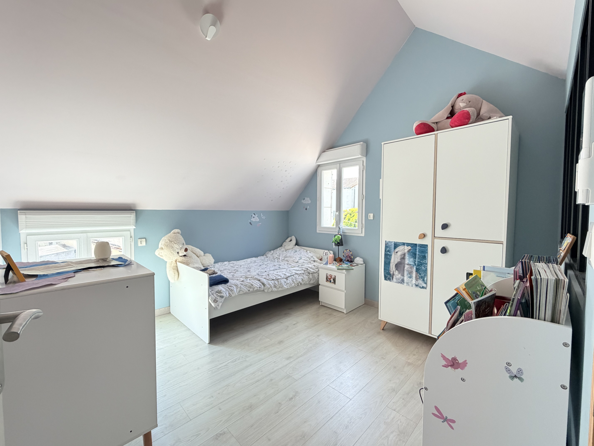 A l'étage, l'espace enfant se compose de deux chambres, d'une salle de bain et d'un coin bureau / salle de jeux sous rampants.