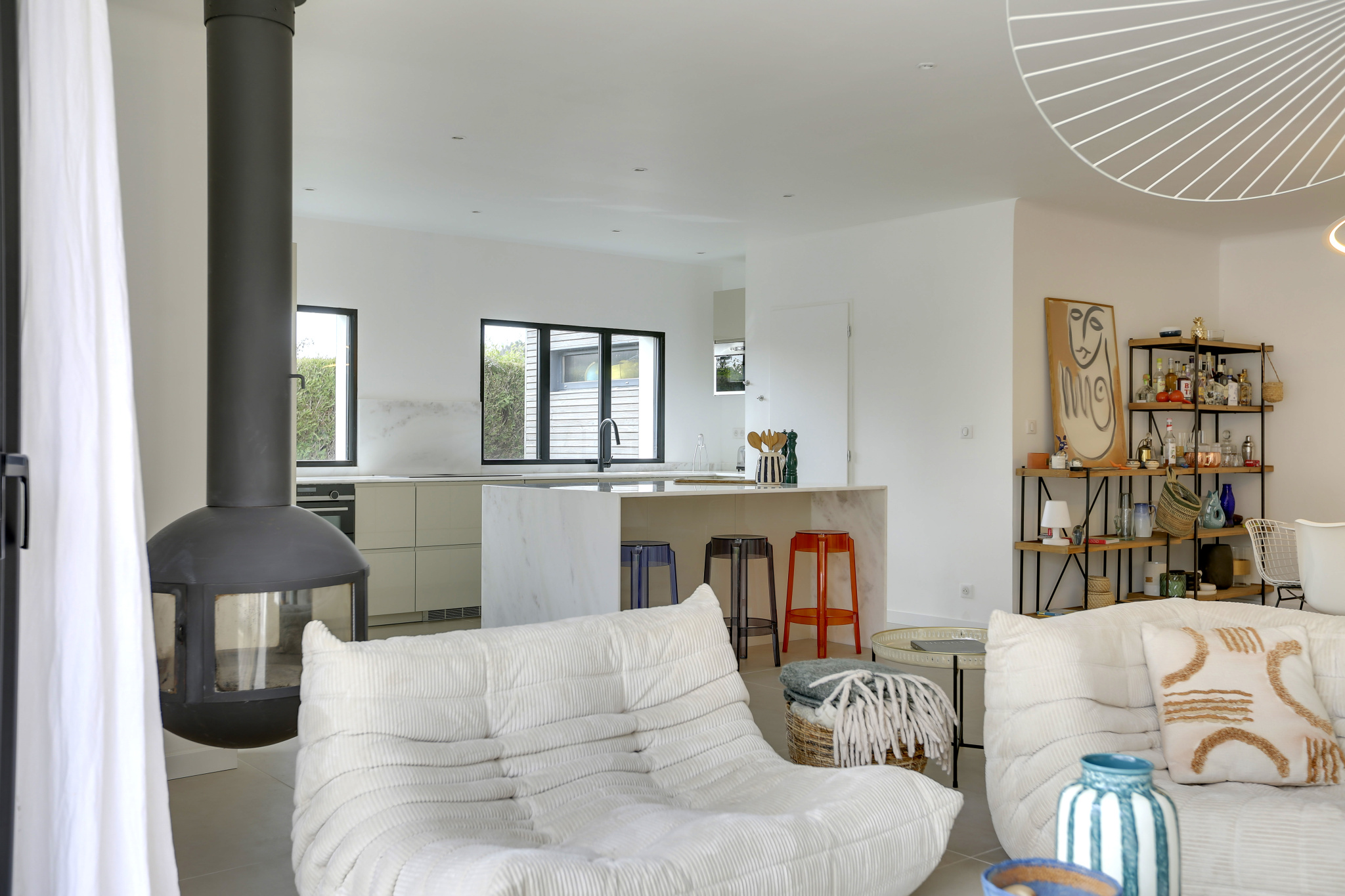 Récemment rénovée, la pièce à vivre, baignée de lumière, intègre une cuisine équipée avec plan de travail en quartz et s'ouvre sur une grande terrasse conviviale avec piscine chauffée, accessible par une baie vitrée à galandage. Un WC et une douche, accessibles depuis la terrasse, complètent cet espace extérieur.