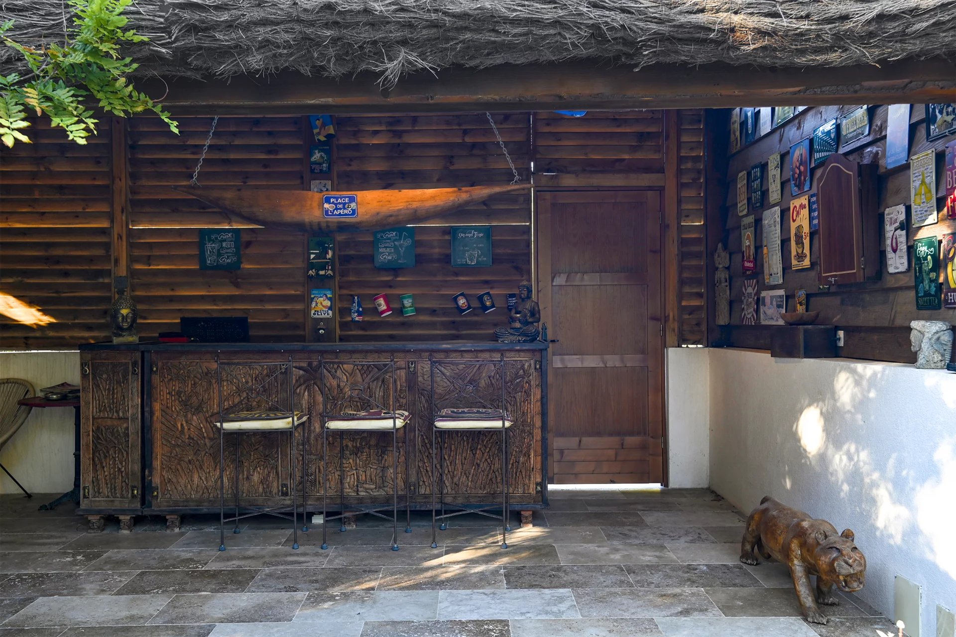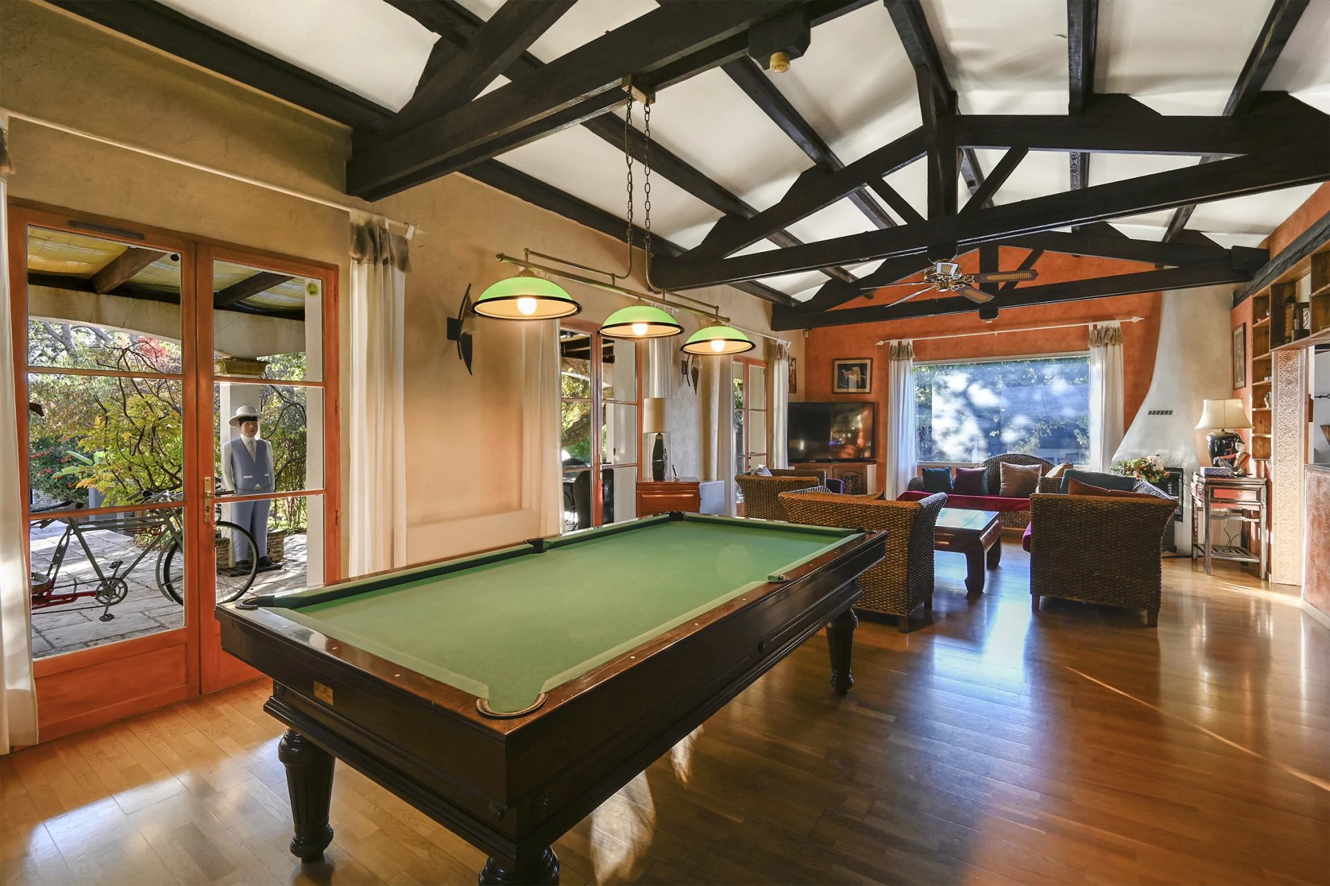La maison principale d'environ 240m2 offre de beaux volumes : une entrée spacieuse ouverte sur un séjour lumineux avec billard (environ 65m2), cuisine semi-ouverte équipée, salle à manger, 4 chambres, un bureau et 2 salles de bain.