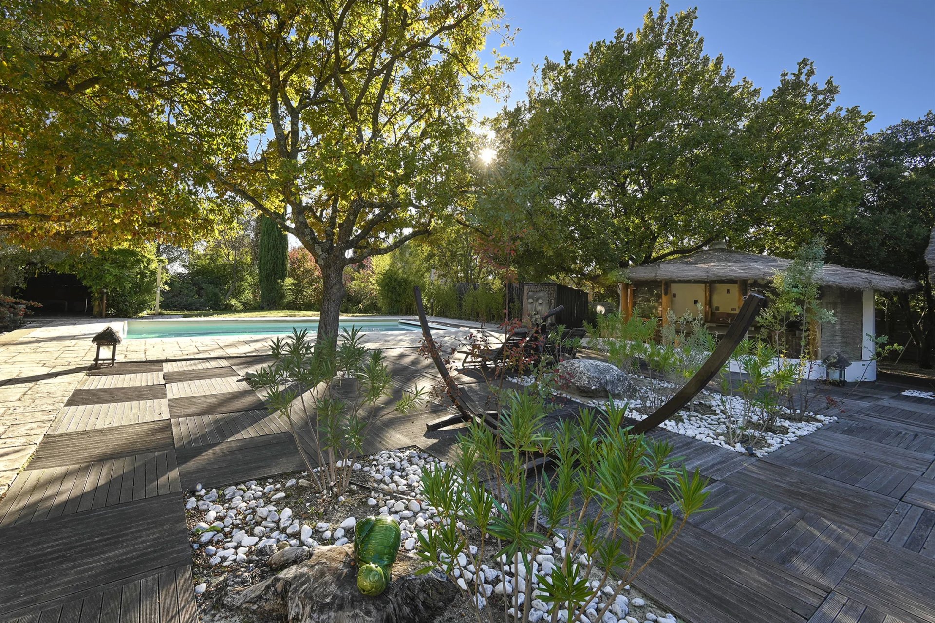Magnifique jardin paysagé avec terrasses ombragées, une grande piscine chauffée (12 x 6 m), un espace avec jacuzzi, une cuisine d'été avec bar, un terrain de volley et un...