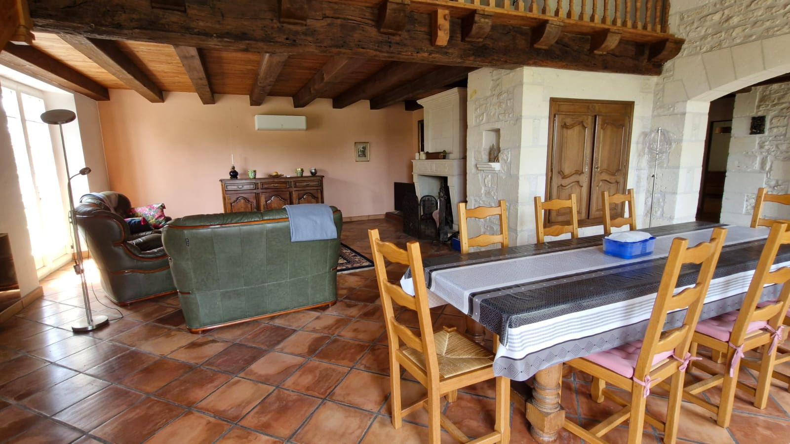 un séjour lumineux de 53,80 m2 avec une cheminée en pierre,