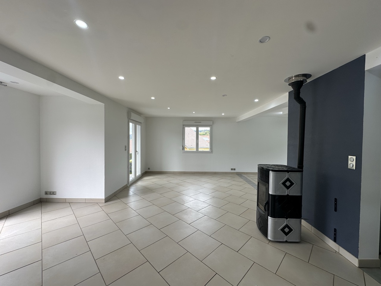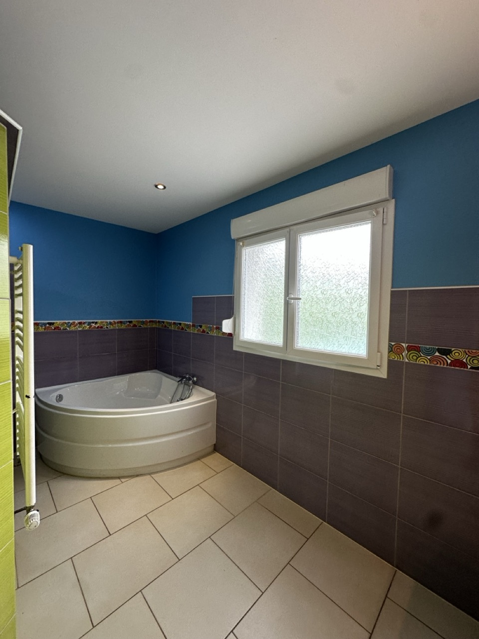 Rez-de-chaussée : entrée de plain pied sur une grande pièce de jour avec cuisine américaine équipée, vaste salon/séjour, accès terrasse, poêle à pellets, W.C. invité, une salle de bains (douche et baignoire).