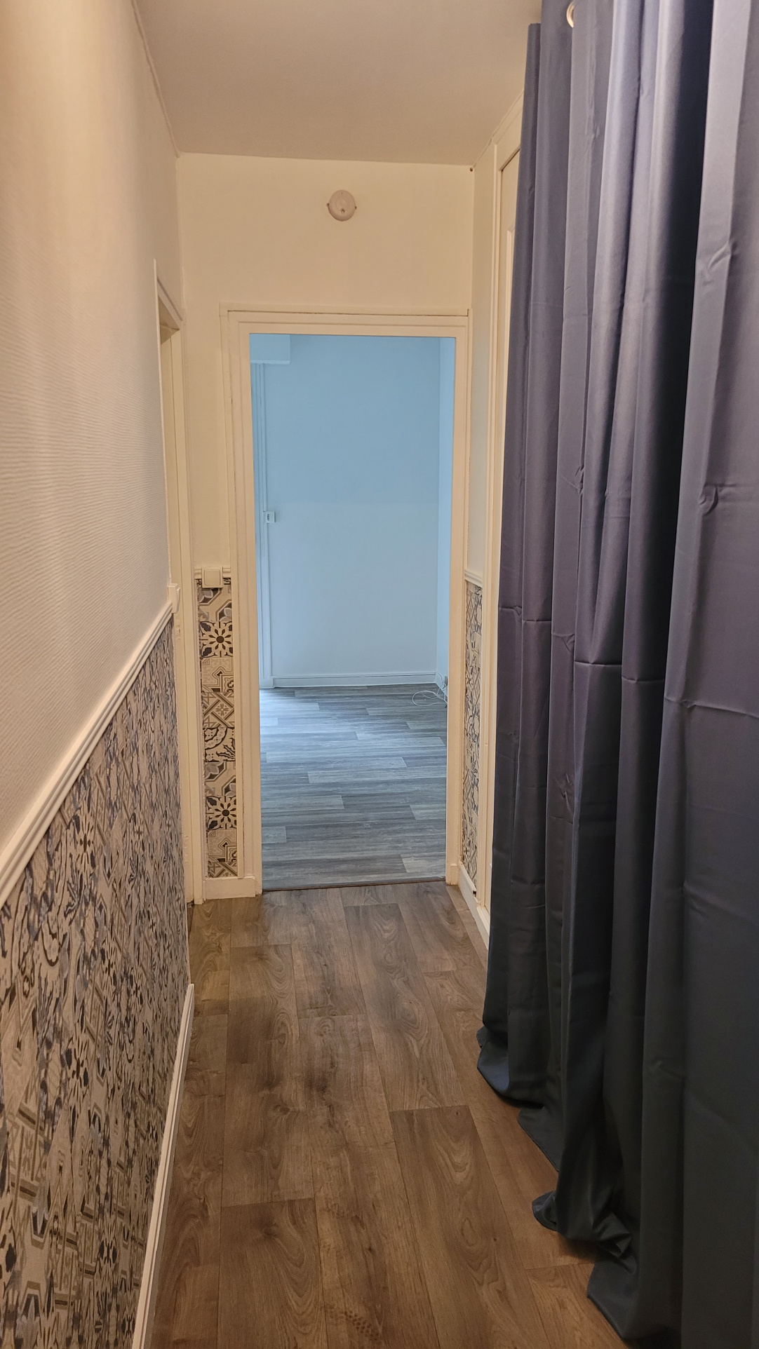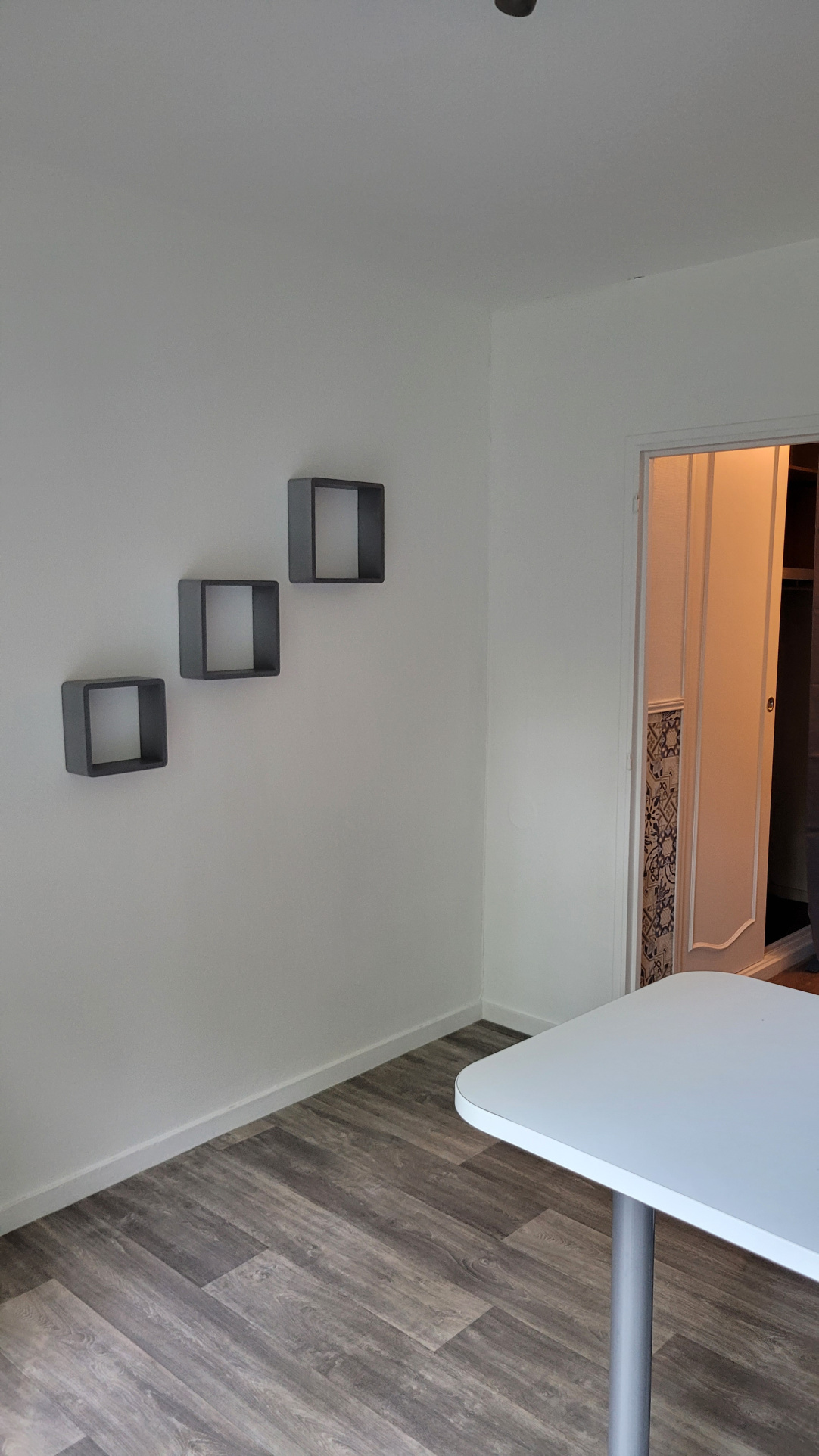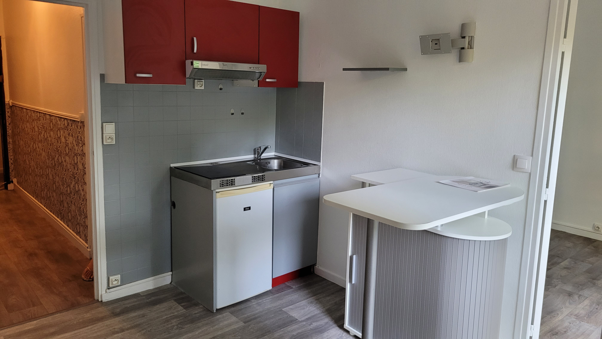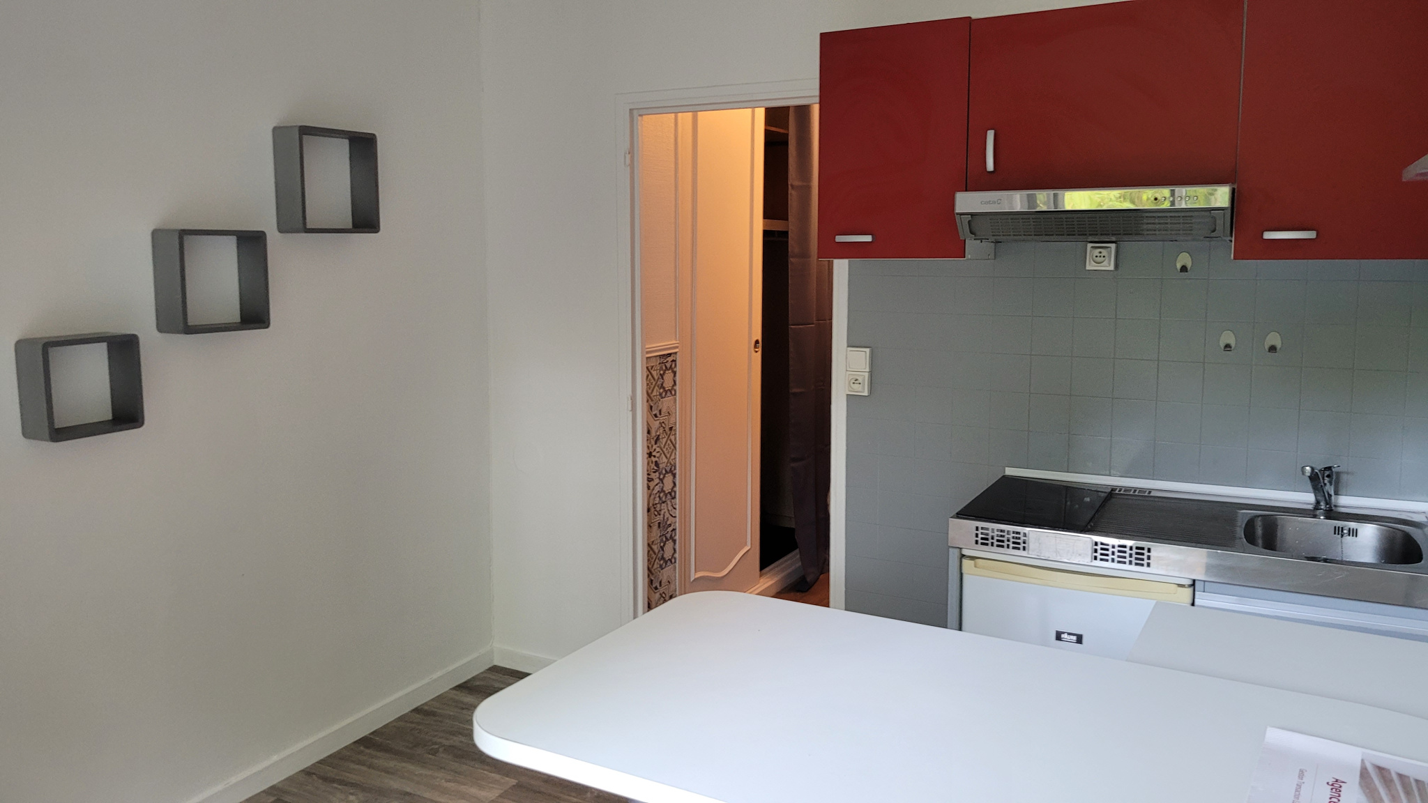 Une entrée avec placard, une salle de bains avec wc, une pièce principale avec kitchenette et coin chambre séparée.