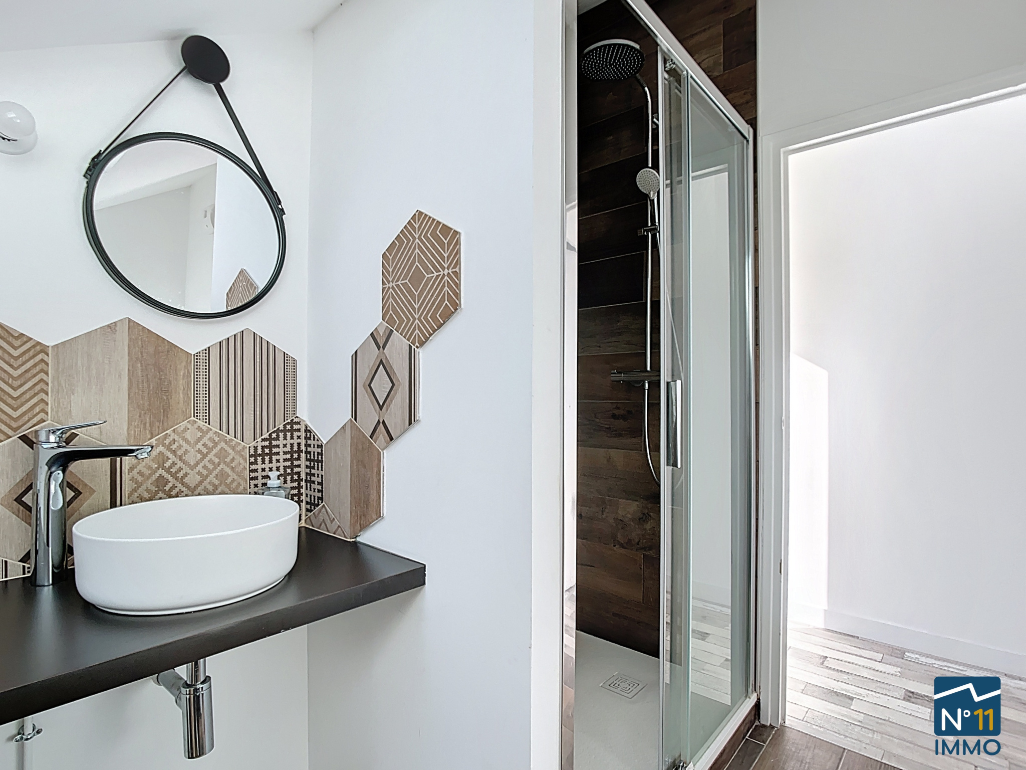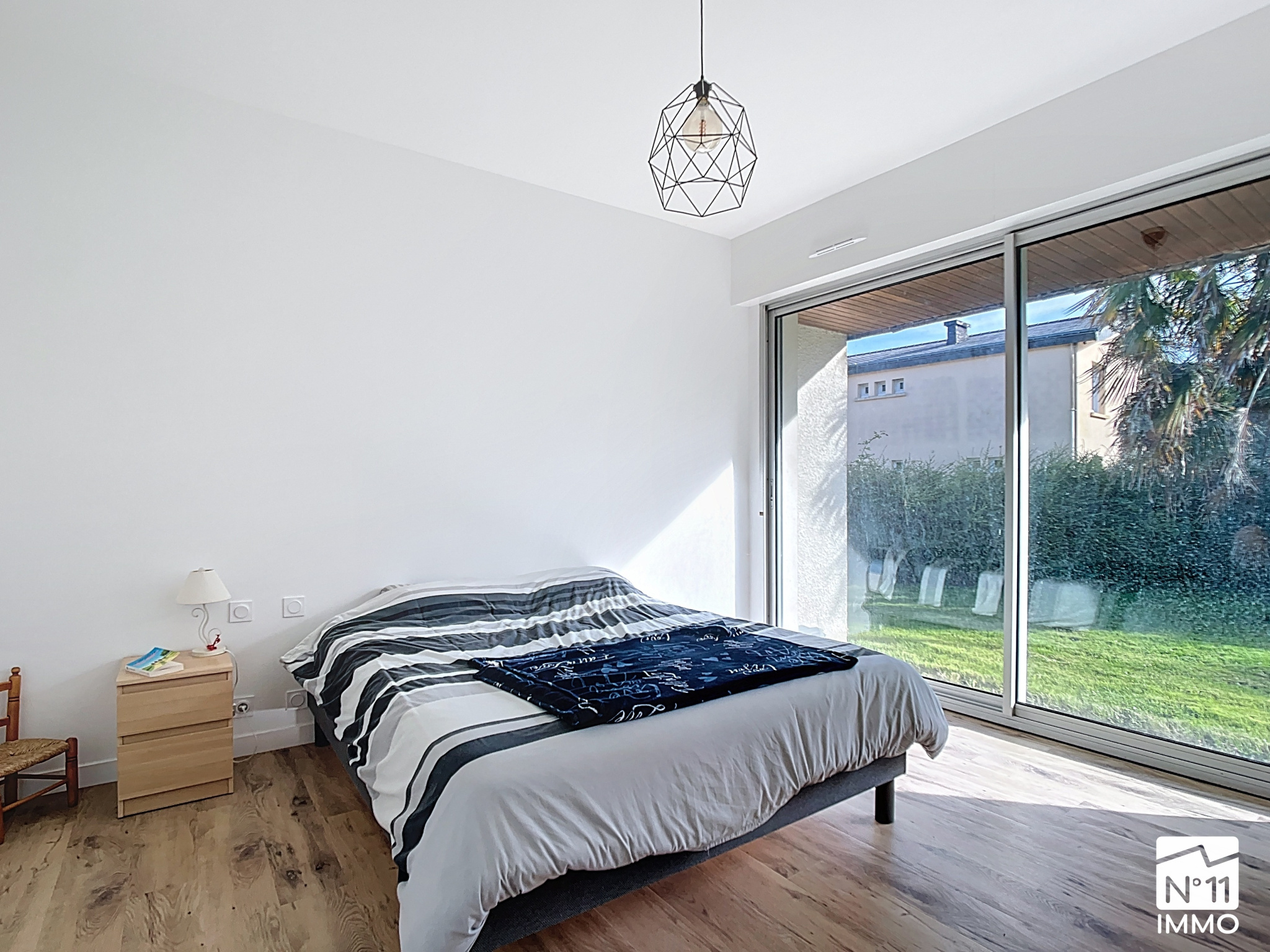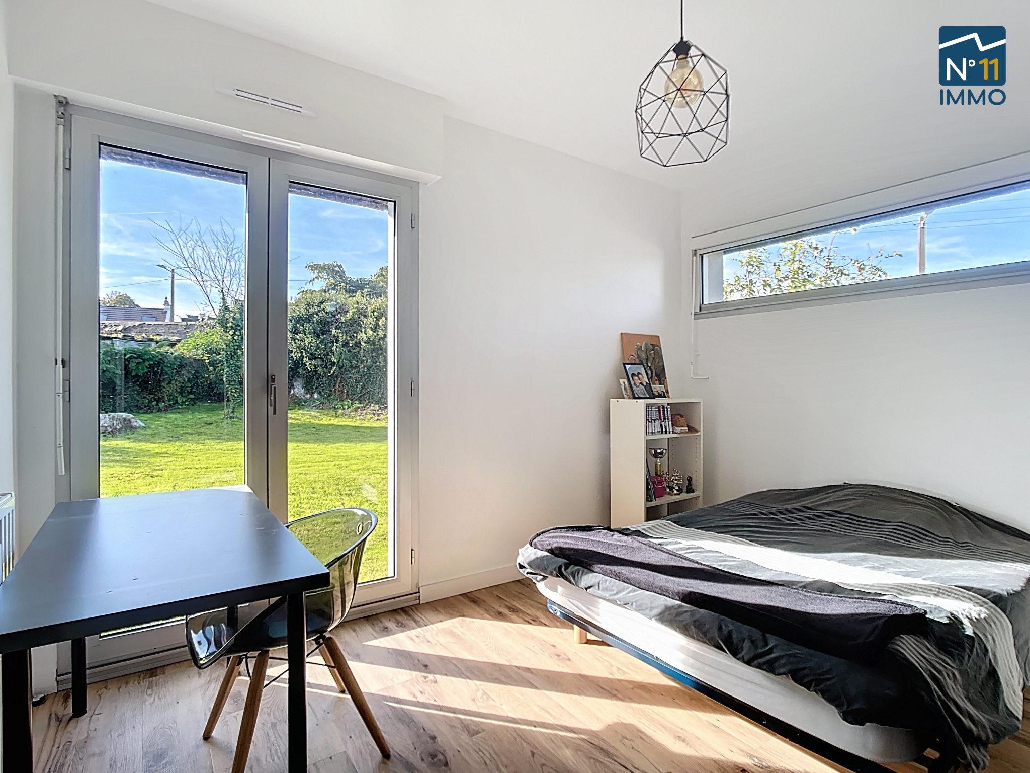 En rez-de-chaussée, l'entrée dessert un grand espace salon-séjour, une cuisine ouverte équipée ainsi que deux chambres dont une avec salle d'eau privative. WC indépendant.
