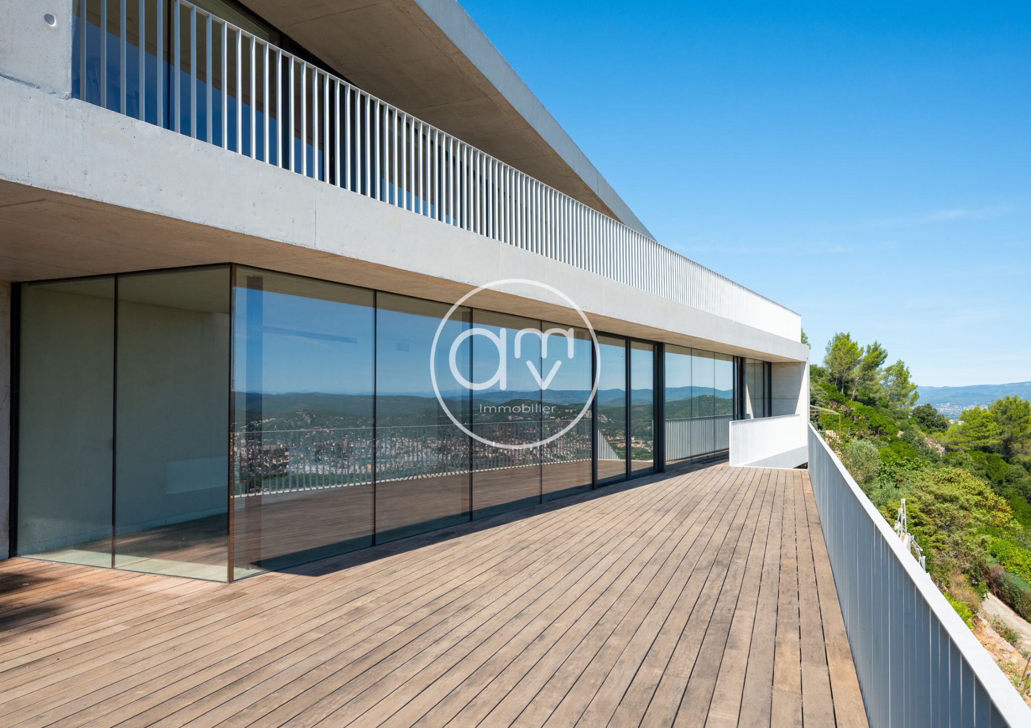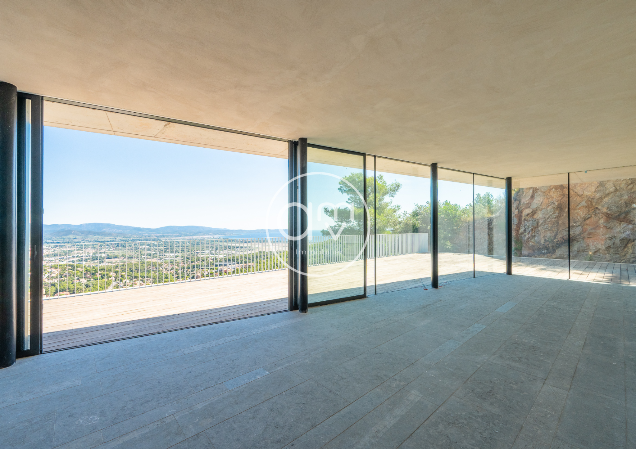 Les panoramas qui s'ouvrent depuis la villa sont d'une rare intensité. Ils embrassent à la fois la presqu'île de giens ainsi que les salins d'Hyères, Porquerolles, la ville, les reliefs environnants et par temps clair les cimes enneigées de l'arrière pays. Une expérience visuelle qui se vit ici à plus de 180o dans une continuité parfaite entre ciel, mer et nature.