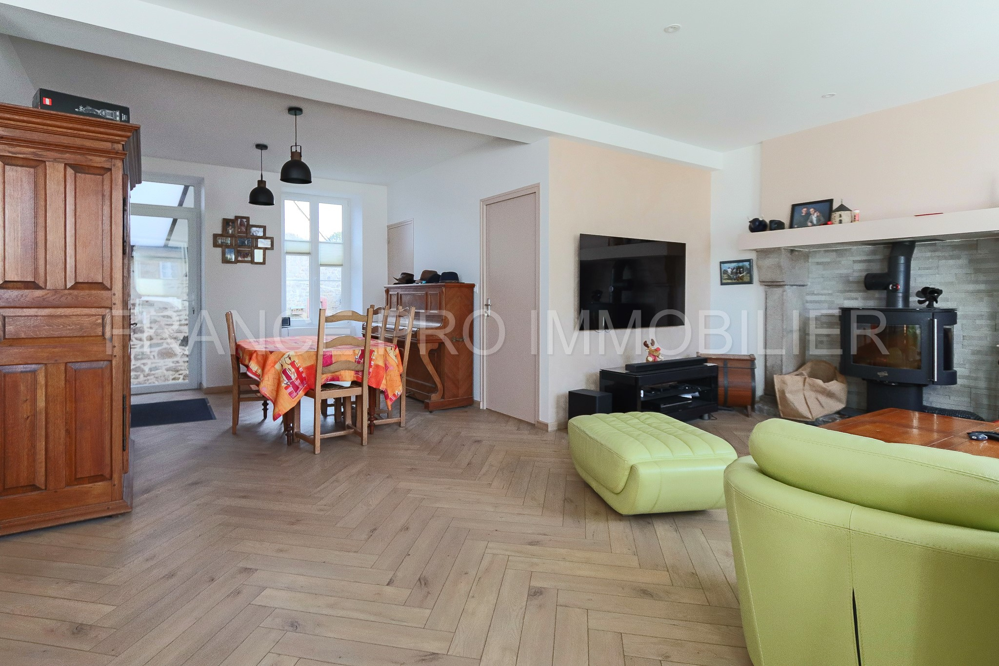 La maison se compose au rez-de-chaussée d'une salle de petit-déjeuner, d'un grand séjour 'esprit loft' avec coin salon et poêle à bois ouvert sur une cuisine aménagée et équipée récente 'tout confort', une buanderie, des sanitaires séparés et un patio fermé donnant accès dans une salle de jeux.