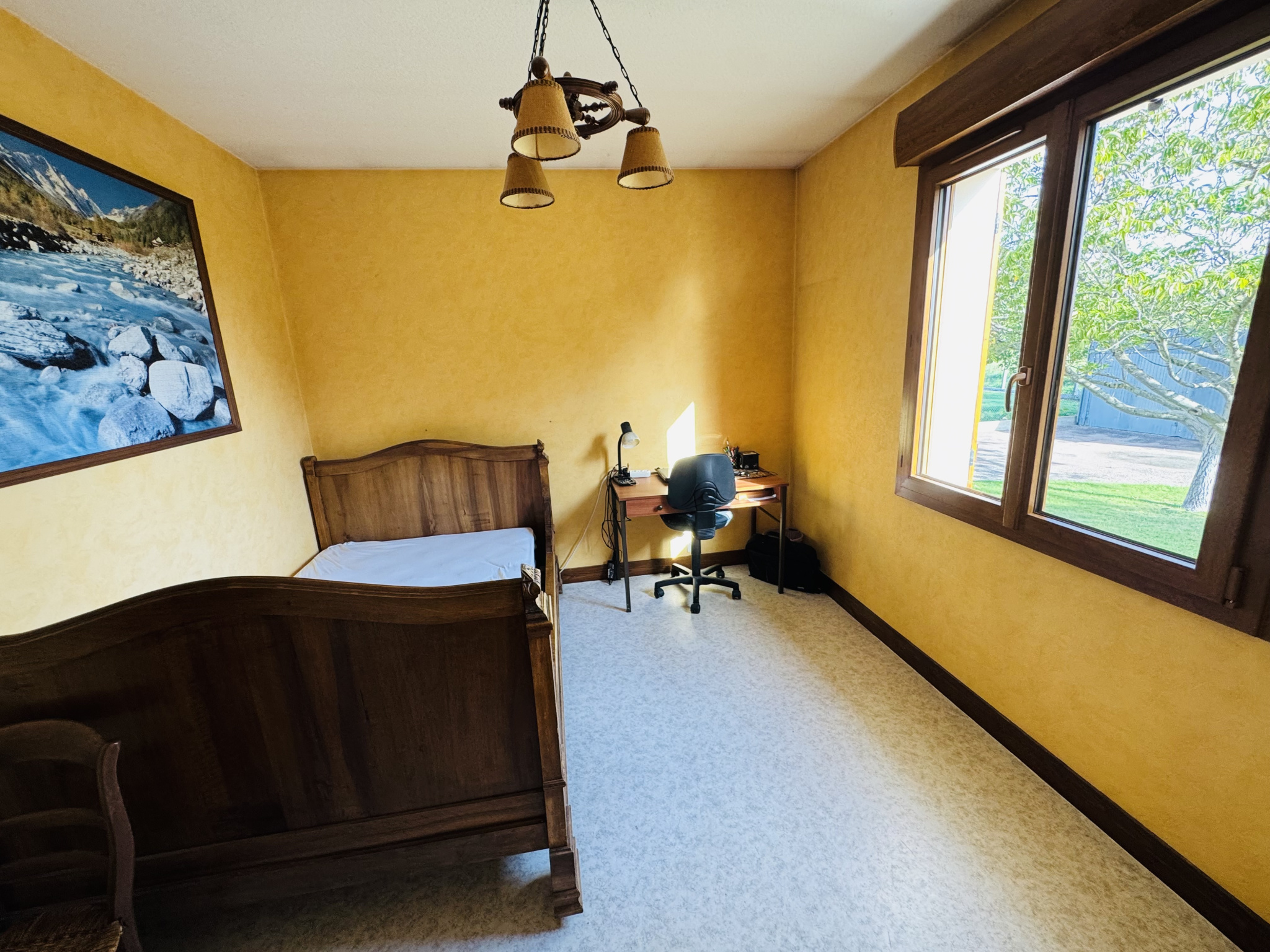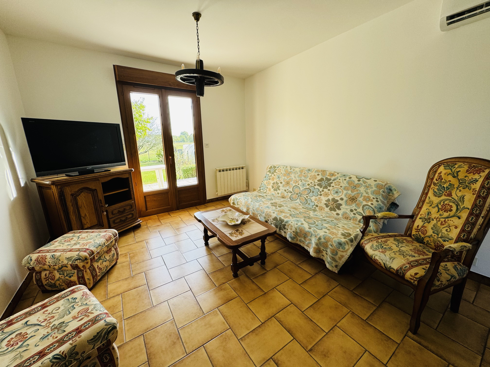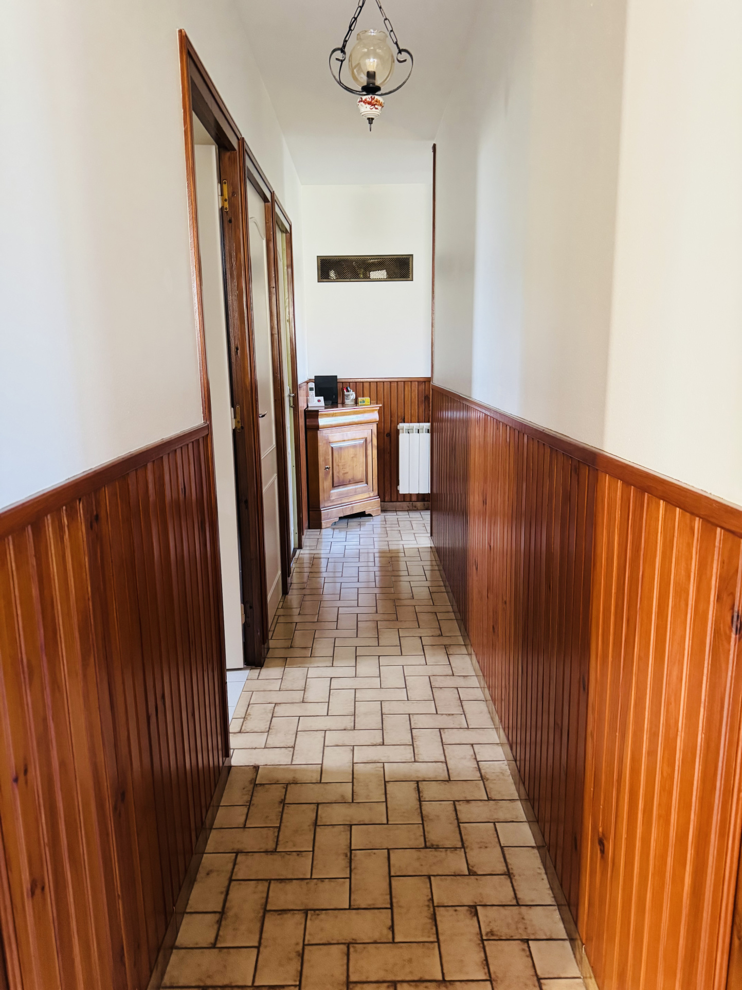 Cette maison de 1985, d'une superficie de 89 m2 environ, est composée d'une entrée desservant une cuisine aménagée et équipée, un salon/séjour avec cheminée ouvrant sur une terrasse (20 m2), un couloir desservant une salle de bains, 3 chambres avec placards, WC.