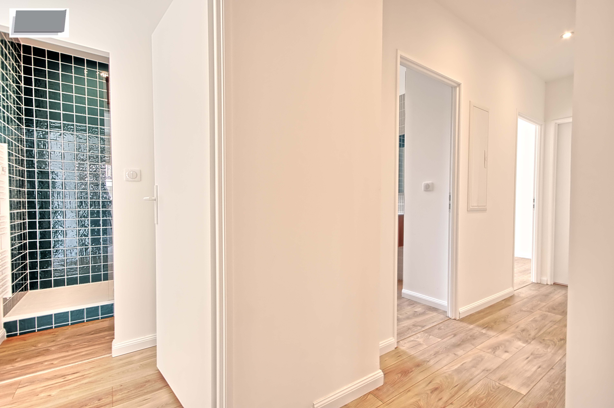 La salle d'eau offre des prestations haut de gamme avec une douche à l'italienne et un sauna, parfait pour la détente. L'appartement dispose également d'un WC séparé avec un point d'eau.