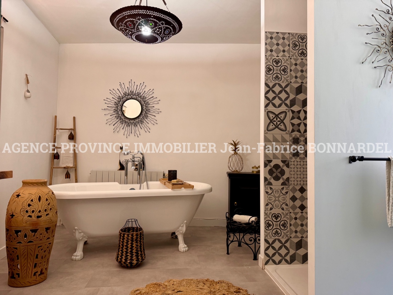 Répartie sur trois niveaux, elle allie le charme de l’ancien – avec ses pierres apparentes et son ambiance provençale – au confort d’une rénovation contemporaine.