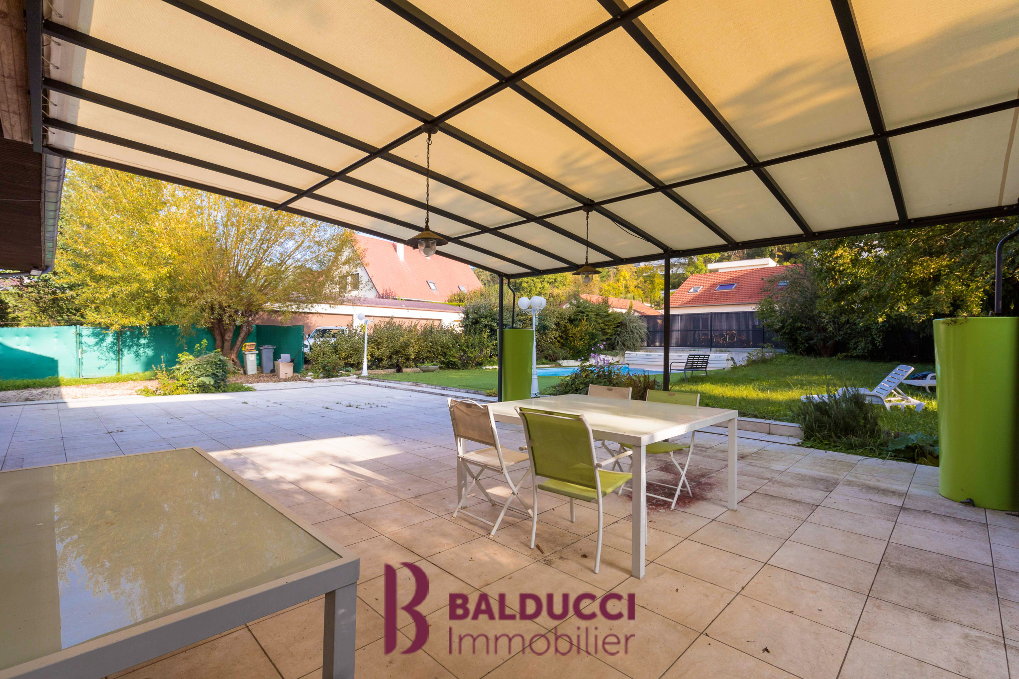 A l'extérieur, vous profiterez d'un grand jardin arboré et clos. Une piscine agrémente cet espace, idéal pour se détendre.