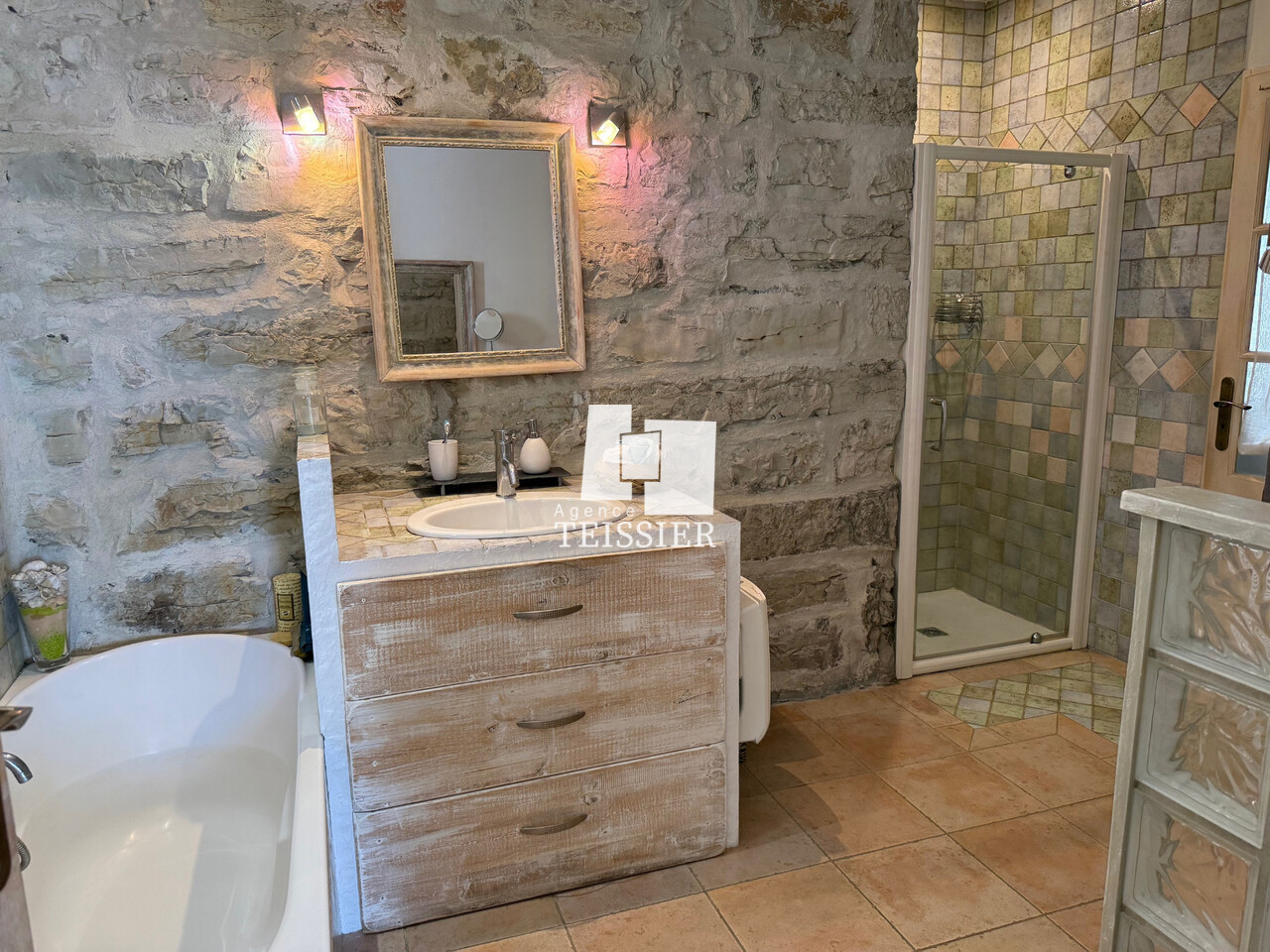 • Maison 1 (env. 60 m²) : ancienne magnanerie en pierre, 2 chambres, salon, cuisine, caves, terrasse avec vue dominante.