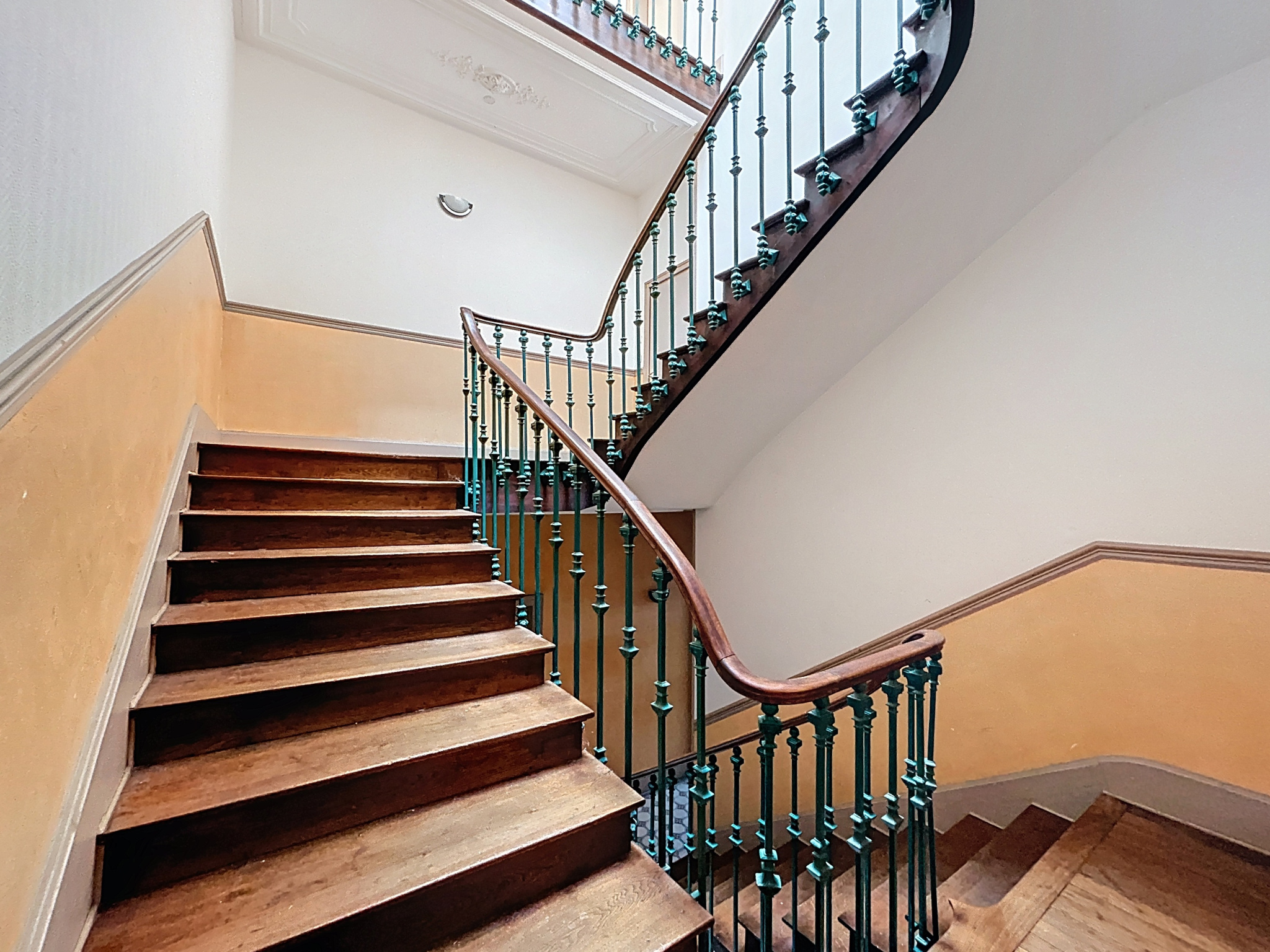 - au rez-de-chaussée : entrée et dégagement avec bel escalier monumental ; un ensemble de cinq pièces, 113 m2, chauffé par une chaudière au gaz de ville alimentant une installation de chauffage central, actuellement loué par bail professionnel 712,73 EUR par mois.
