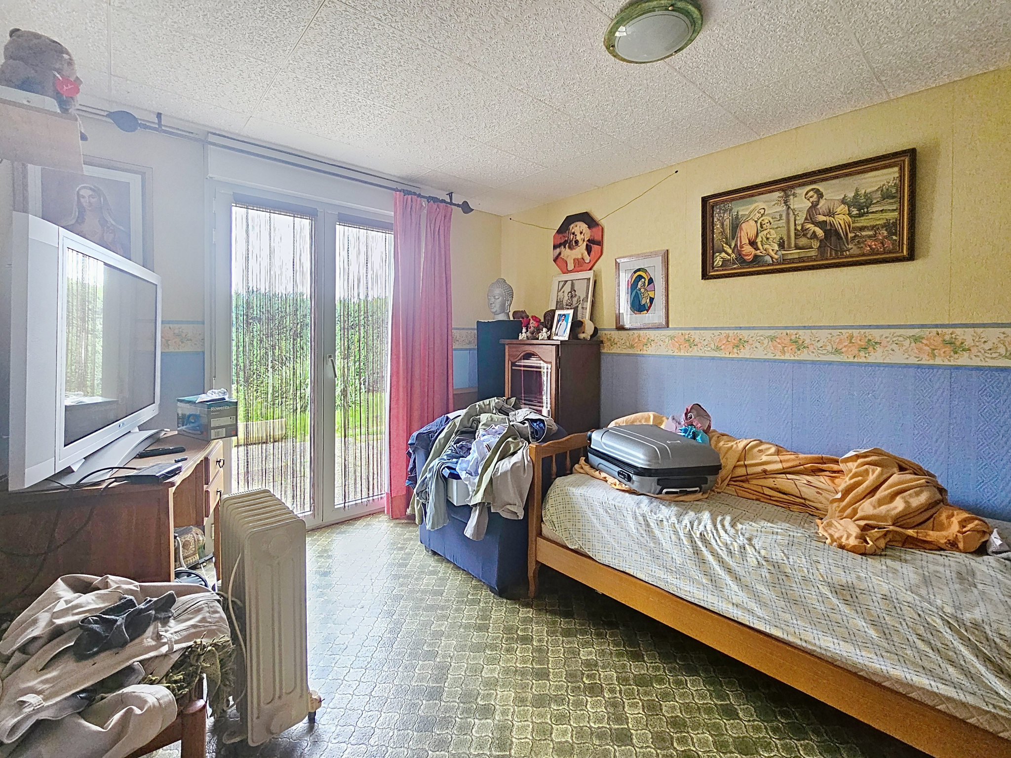 - Chambre (9,80 m2) : sol revêtement plastique.